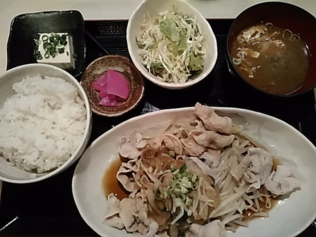 仙台市本町にあります。ランチは全て800円(税込)です。今回は、週替わりメニューの豚の湯引きキノコポン酢定食をいただきました。メインの豚肉の他、サラダと豆腐、お新香が付きます。ご飯はちょっと固めでした。