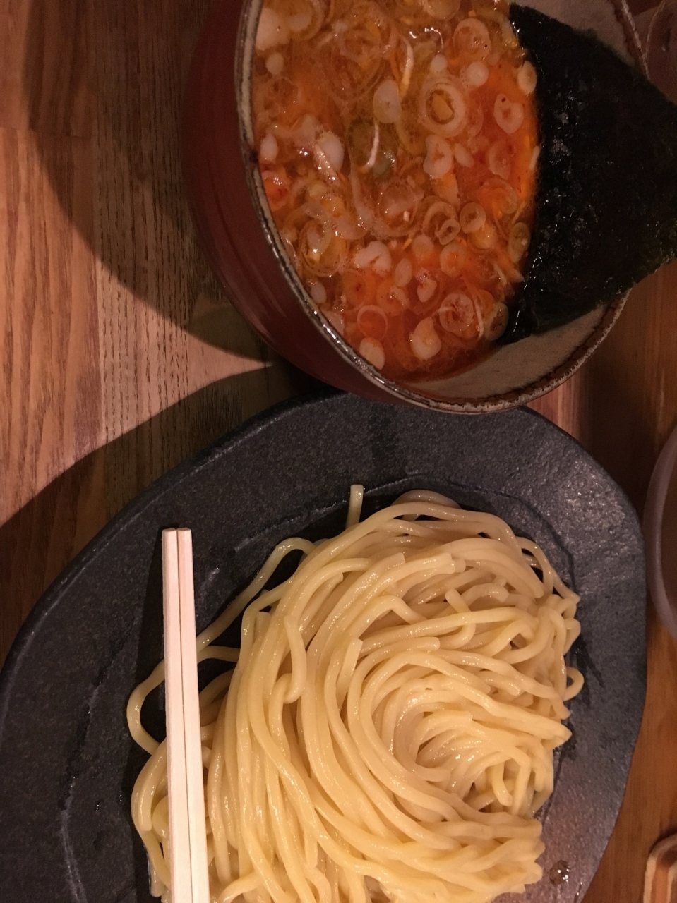 久々につけ麺が食べたくなったので利用しました。18時前でしたのですぐお店に入れましたが店内はほぼ満席でした。辛味つけ麺をオーダー。たまねぎをたっぷりスープに入れて食べるのがマイブーム。カツオの削り節(?)を麺にかけても美味しいです。