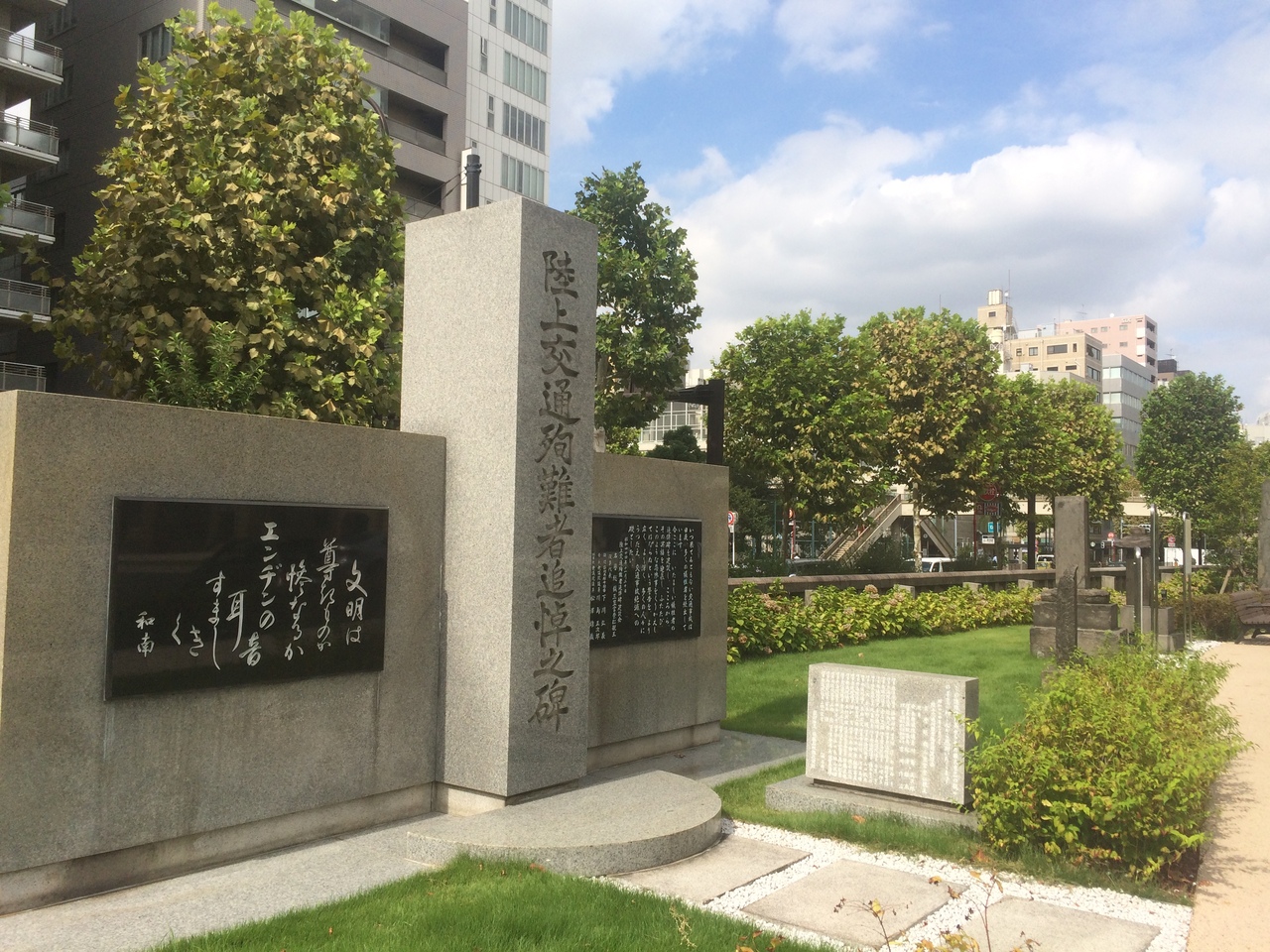 建設は昭和44年と年月が経っていますが、綺麗な新しい石碑でした。三笠宮崇仁親王の名前で、犠牲者のをこころから、その冥福を追慕し、ふたたび、悲惨時を起こさぬよう、交通事故僕別のへの礎としたいと書かれていました。四角い石碑で中央に細長い塔のような石が立ち、左右には黒い文字が書かれていました。
