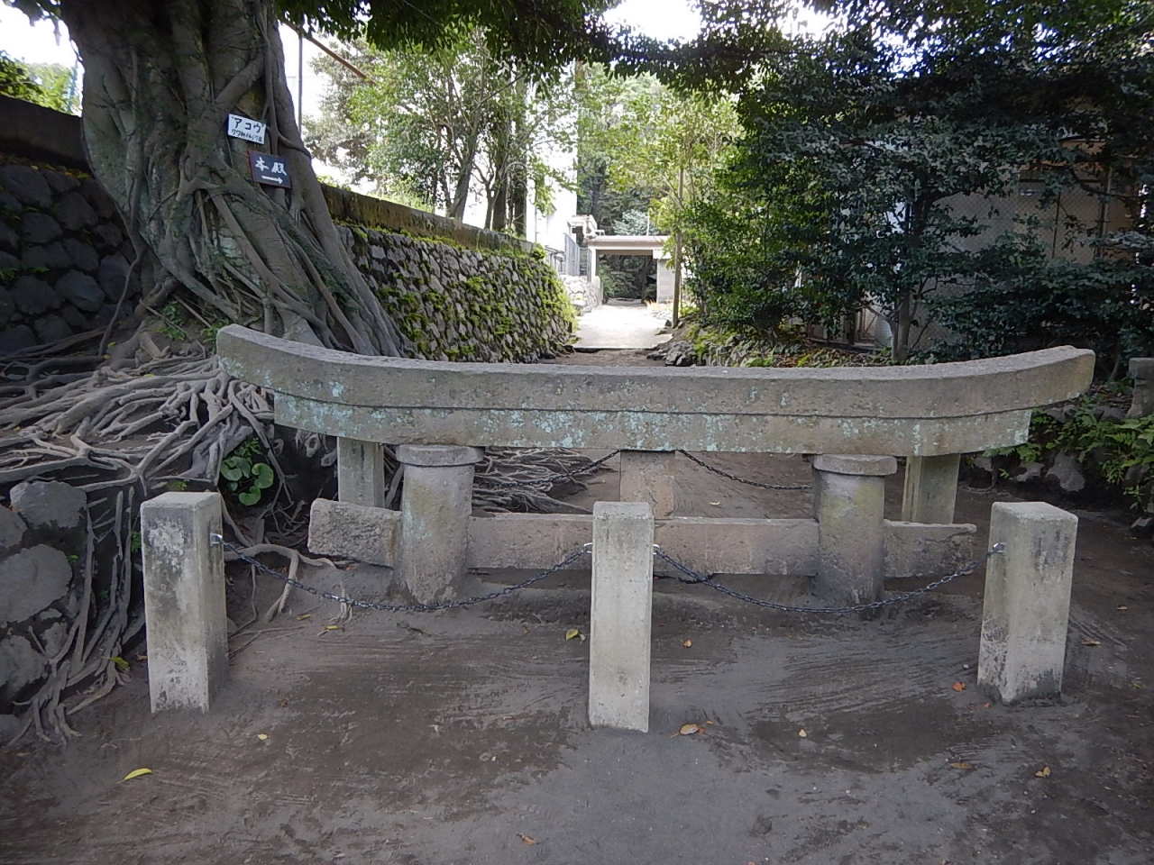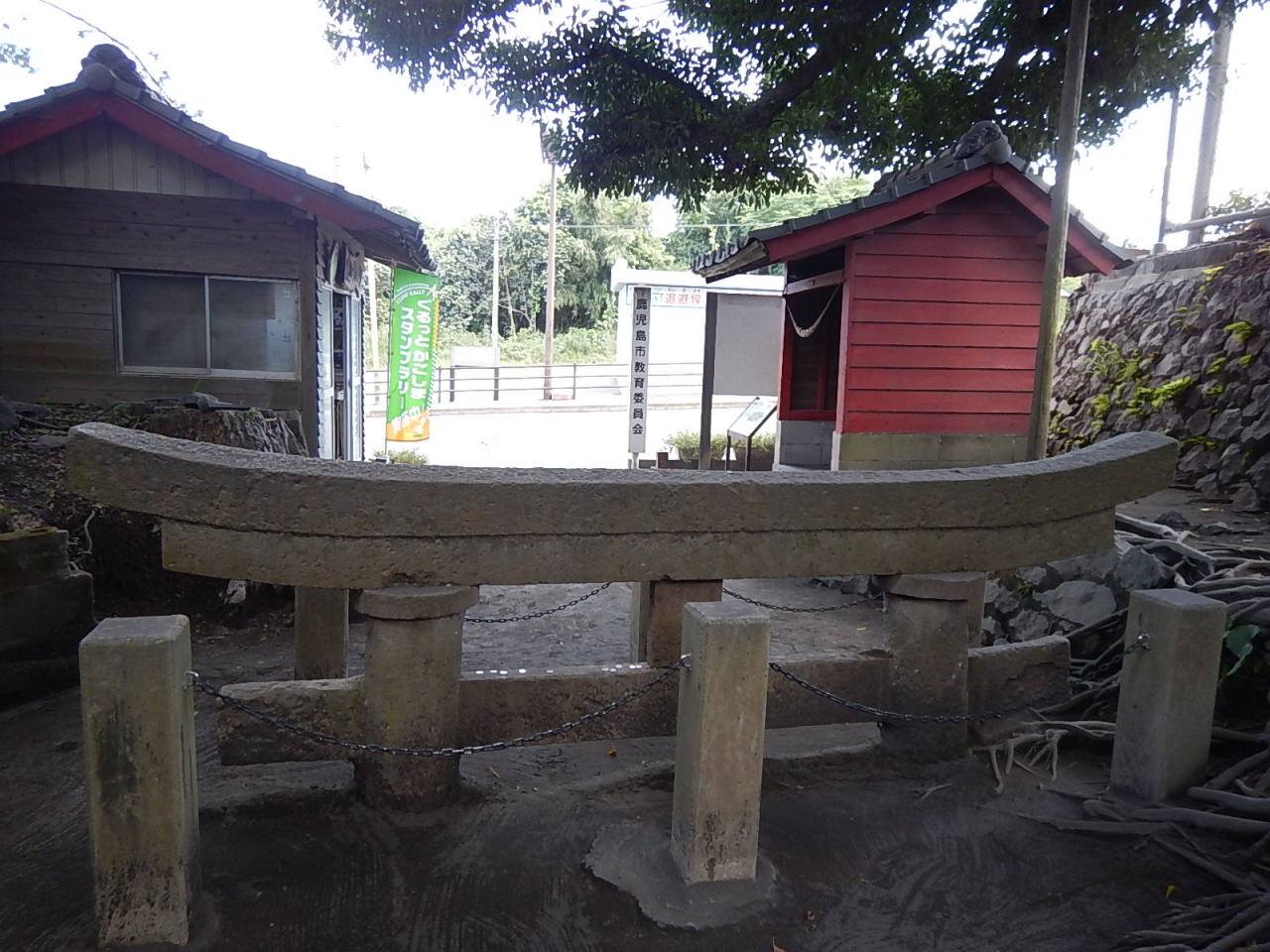 駐車場有。中学校の横にある小さな神社だが、鳥居が火山灰でほとんど埋まっており、上部の梁の部分しか地上に残っていない。奥に進むと本殿があるが、実際の本殿はやはり火山灰に埋まっており、仮本殿のようにプレハブが建てられている。