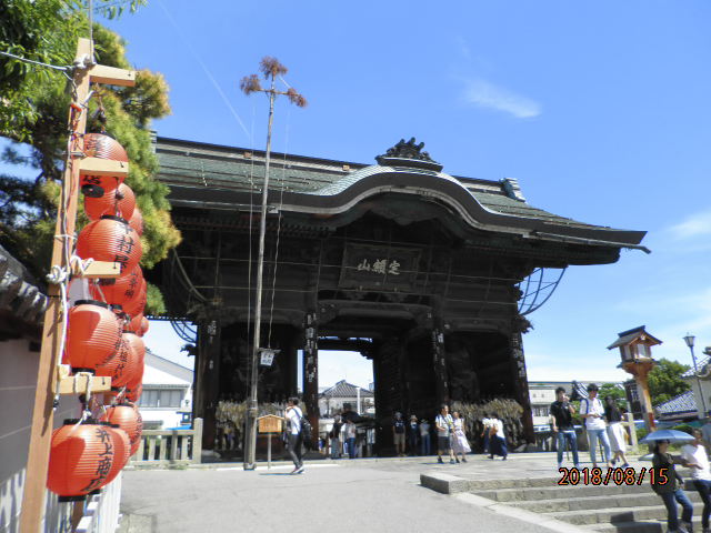 善光寺参道を歩いていくと、最初にくぐる門がこの仁王門です。門の左右には、迫力ある阿吽の仁王像がありました。この仁王門は、地震や火災で焼失し、大正時代に再建されたものですが、歴史を感じます。この門をくぐると、三門まで、両側にお土産物店などの並ぶ仲見世が続きます。