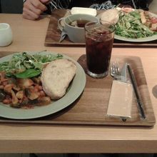 夜だったのですが、手前のカフェ席を利用しました。奥がフレンチ・レストランのようでしsた。カフェは、カウンターで1~2品メインを選ぶセットメニューにしました。セルフ形式です。店内は綺麗で静か、座席もゆったり使えて良かったです。料理もおいしかったです。