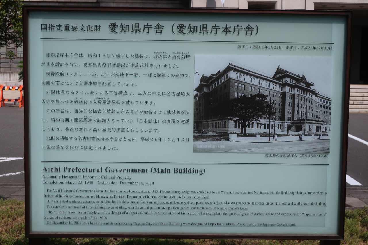 名古屋には戦前に建てられた近代洋風建築が残っていますが、愛知県庁本庁舎はその中でも代表する存在です。昭和13年に建てられた帝冠様式のどっしりしたスタイルが、まるでお城の用にも見えます。内部も見たかったのですが、土日で中には入れず外観だけの見学になってしまいました。行くなら開庁しているときがお薦めです。