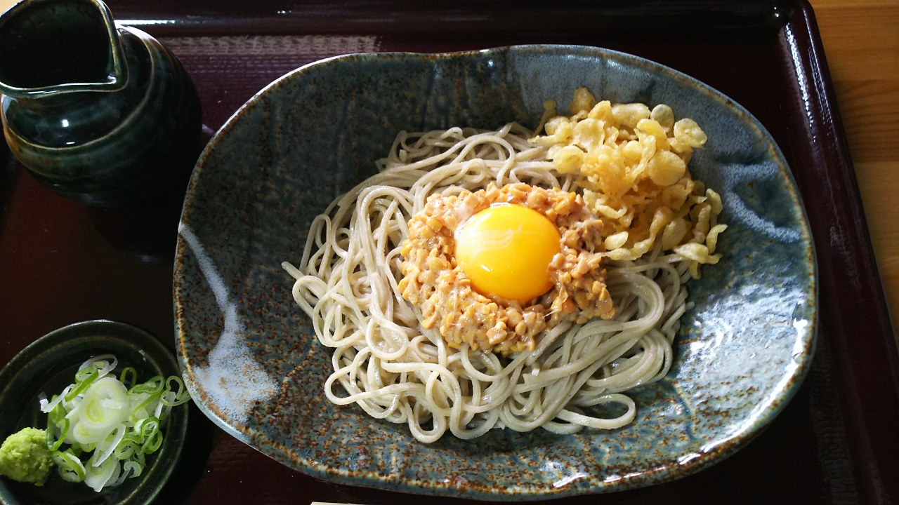 今回は冷たい納豆ぶっかけと温かい納豆蕎麦、そしてとり天3タワーを注文。