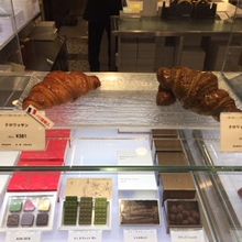 ヒカリエ地下お菓子売り場を歩いていたら綺麗なショーケースに彩り鮮やかな美しいショコラやマカロンが並んでいる高級感あふれる売り場があり、ガラスケースに入っているつやがあるおいしそうなクロワッサンが並んでました。抹茶を練りこんだクロワッサンがおいしそうなので買ってみました。外はパリパリ中はもっちり、最高のクロワッサンです。