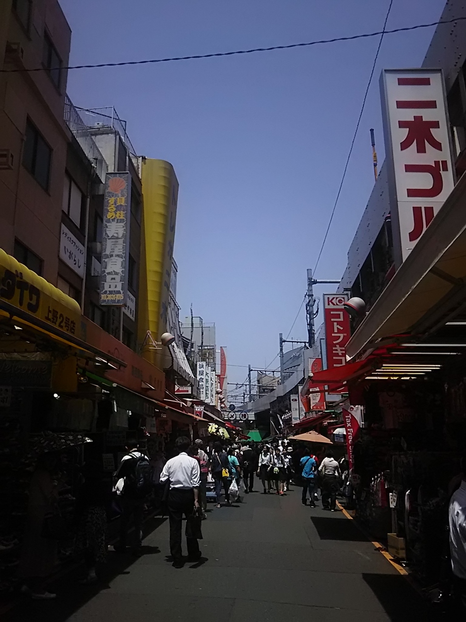 年末などかなりでテレビで登場する上野から御徒町につながるアメ横の商店街ですが今は観光客などもだいぶ増えて日本人だけではなくてとてもインターナショナルな場所になっています。海産物もあれば乾物もありスポーツ用品店など色々なお店がある。すこし、道路が汚い