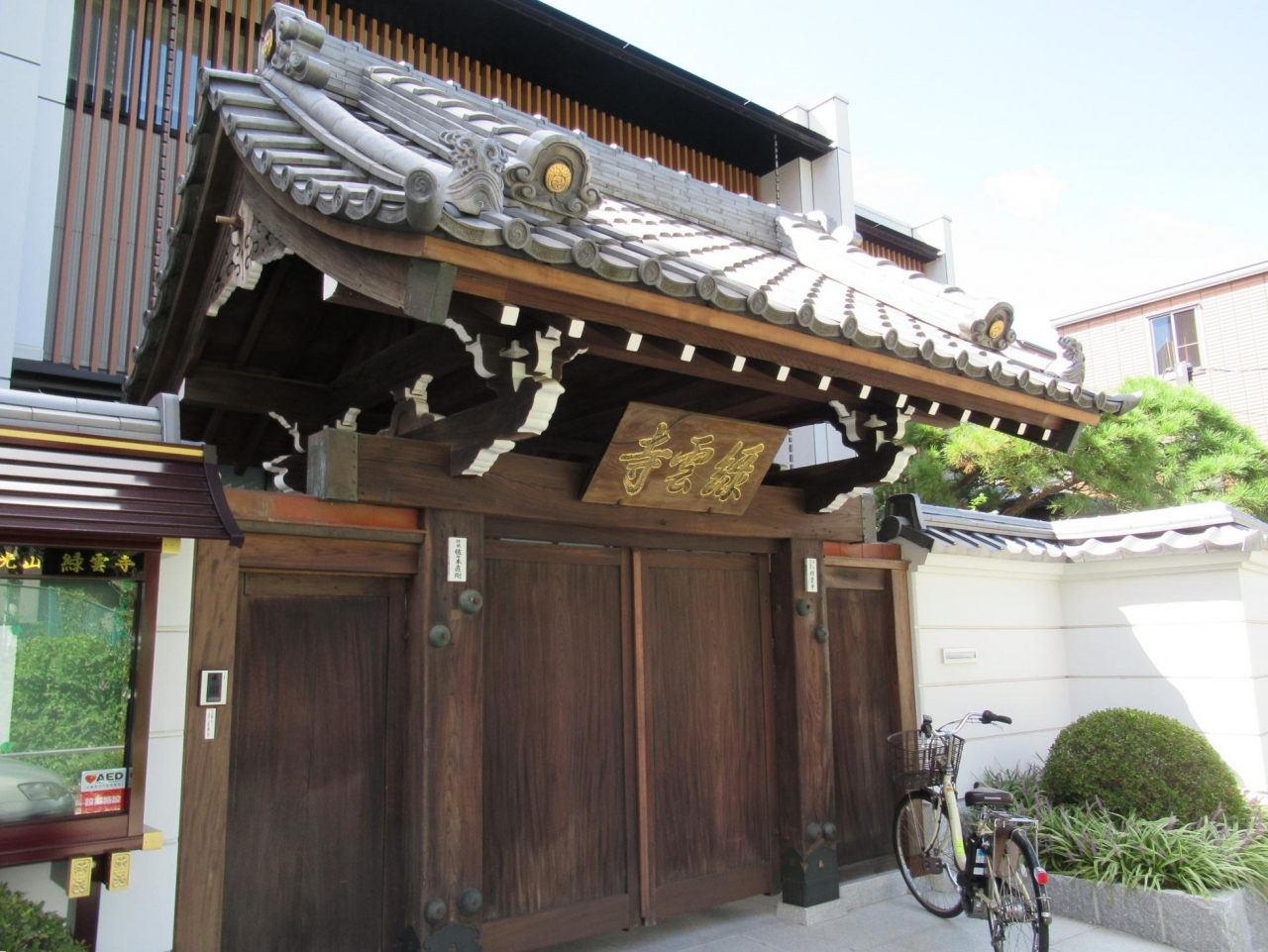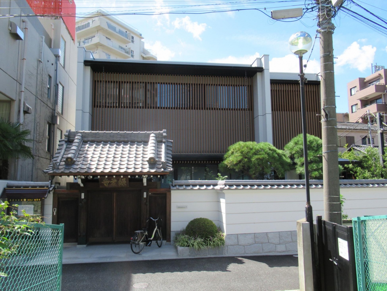 山門が閉まっているので外側から見たところ、本堂と思われる建物は、従来の寺院らしくなく現代的 (?) な造りになっています。