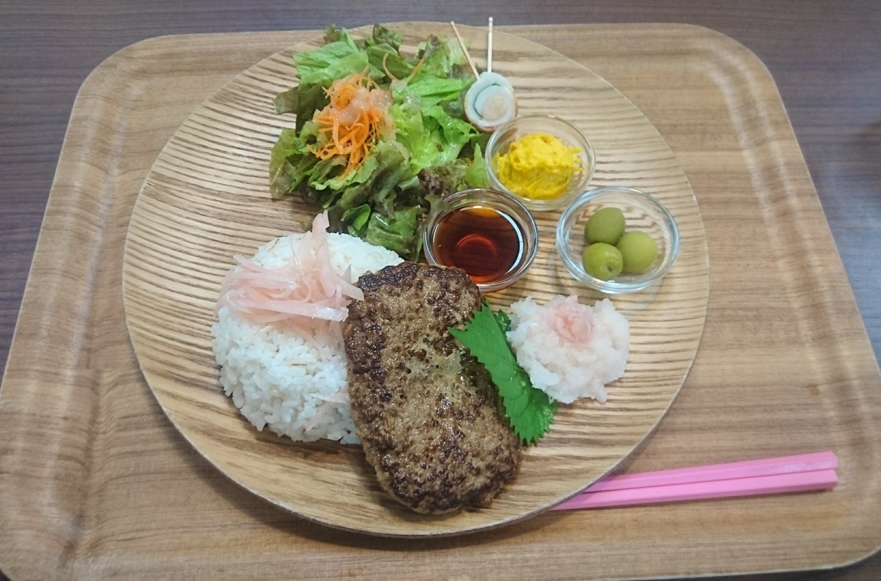 (土)の12時半過ぎに訪れた。入って右手にショップとカフェ。カフェメニューは生姜を使ったメニューが充実。生姜の風味や味が感じられる度合いが生姜マーク3段階で表示してあった。ソフトクリームはすぐに提供されたので料理が出来上がりを待つ時間に頂いた。ランチにハンバーグプレートを。受取口に刻み生姜が置いあり無料で増し増しが出来る。