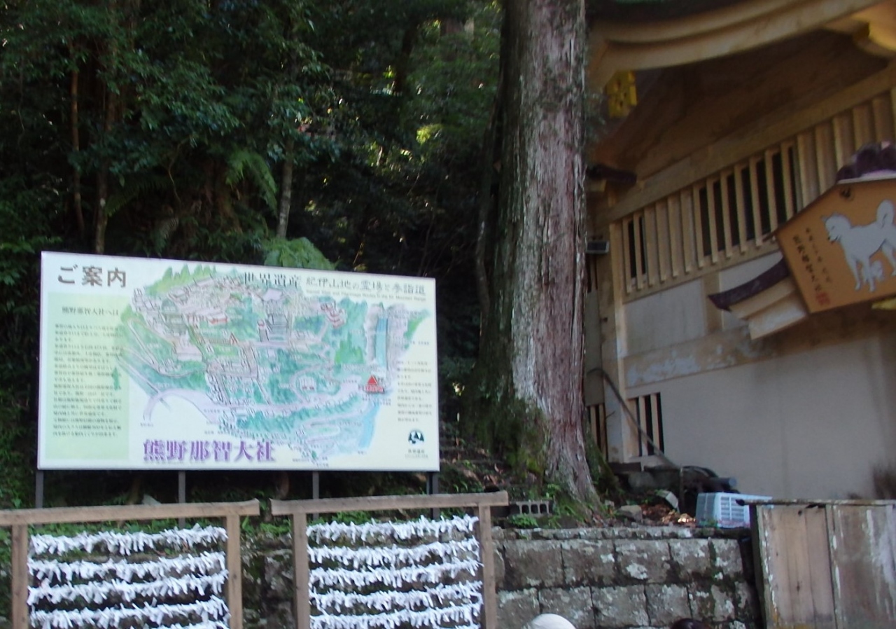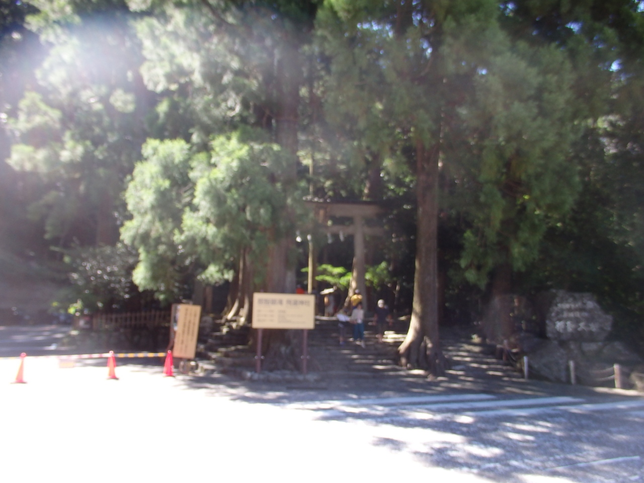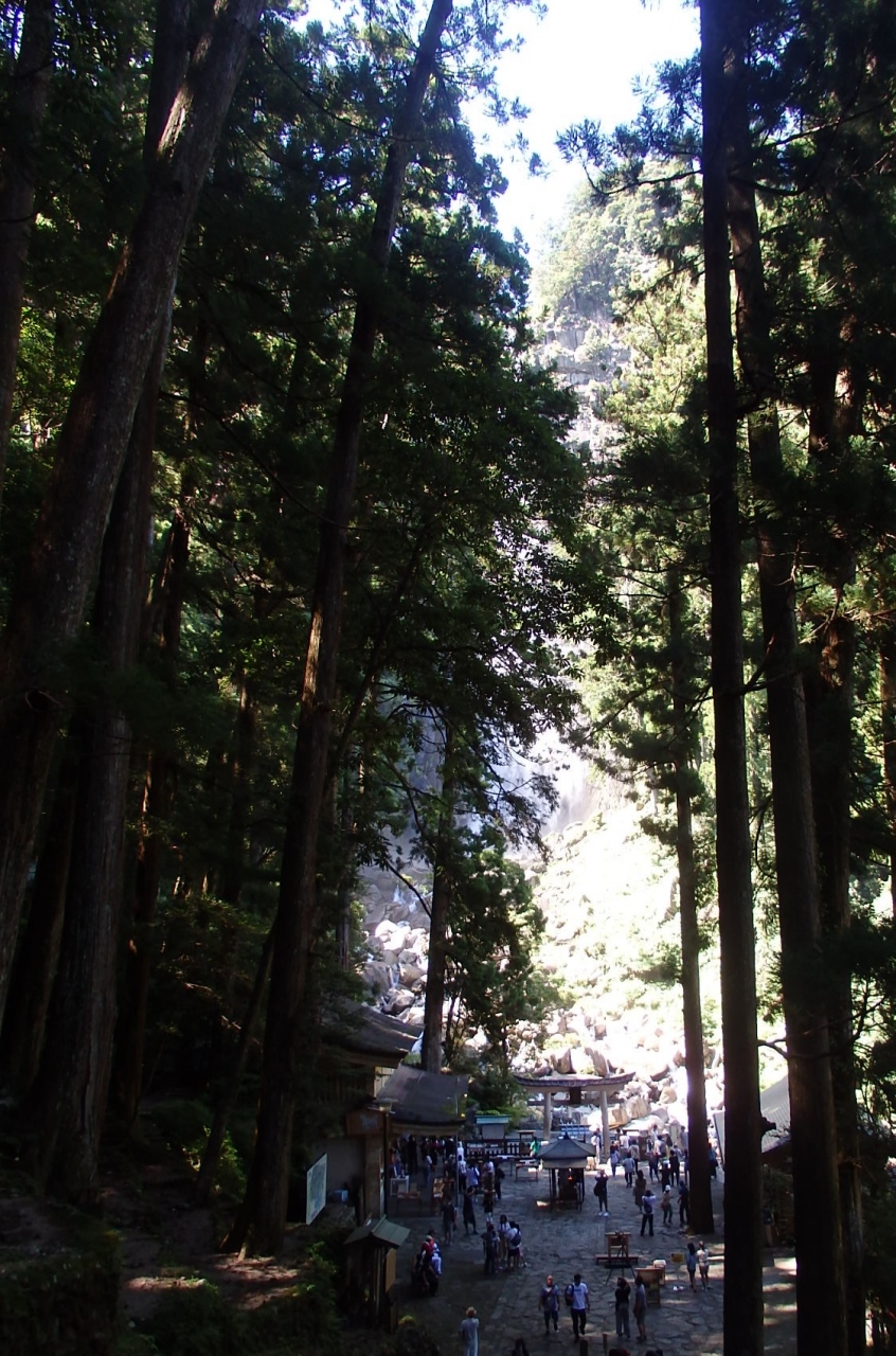 那智の滝の麓へ向かって近づいていくと、「那智の滝前」というバス停の近くに、「那智大滝」と書いた石碑がありました。少し奥に鳥居があり、くぐって参道を下っていくと、那智の滝が見えてきました。。その手前には、鳥居や社殿があり、どうやらここが「飛瀧神社」になっており、那智の滝を祀っておられるようでした。