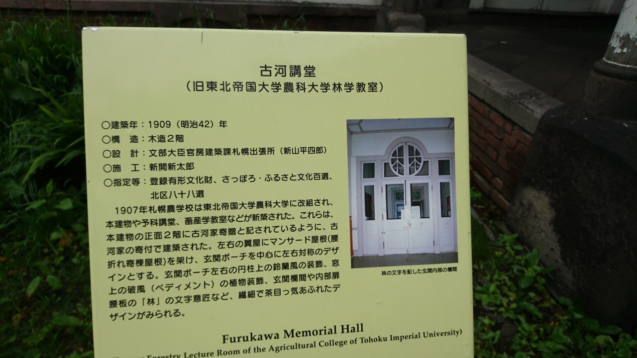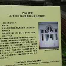 北海道大学のキャンパスにある講堂です。古河財閥が足尾鉱山鉱毒事件の償いとして贈した、国内で唯一残る古河家寄付記念事業の寄付金によって建てられた教室です。有形文化財ですが、現在、文学研究科の校舎として使っているため、観光客は中に入ることができません。 林学教室だったため随所に「林」という文字が施されているので外観を見て、当時の想像を掻き立てることはできます。