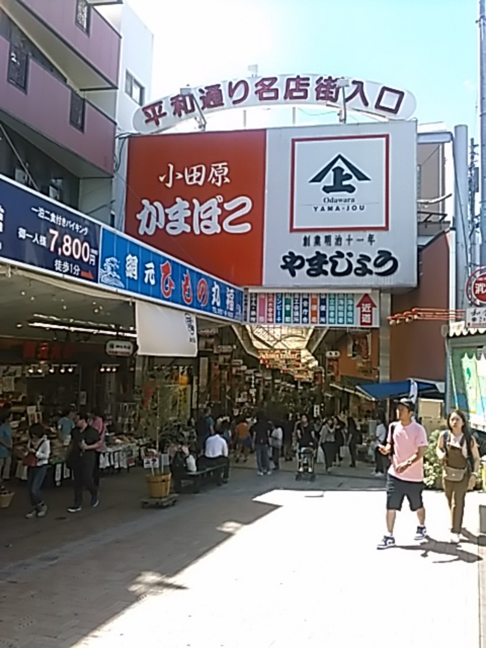 熱海駅前、右手、一番手前のアーケード街で非常に駅に近いです。全長200メートル弱に45軒がひしめいていて、ちょっとした時間でも見ることができます。干物や海産物のお店が多く、試食が充実している店もあり、味を確認してから買い物することができます。
