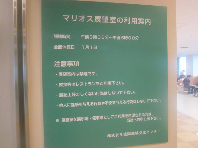鉄道旅の際、盛岡駅にて30分ほどの乗り継ぎ時間があったので、ここに足を運んでみました。盛岡でこの位しか時間が取れない場合は、まず観光の第一候補としてここに足を運ばれると良いと思います。入場無料で、岩手県一の高さを誇る建造物からの展望を存分に楽しむことが出来ます。尚、地元の方にとっては、ここは最近ではランチバイキングで人気になっているとのことで、お昼時にいらっしゃる場合は、リーズナブルなバイキングを再考の展望を楽しみながら頂く、というのも良い選択肢かなと思います。