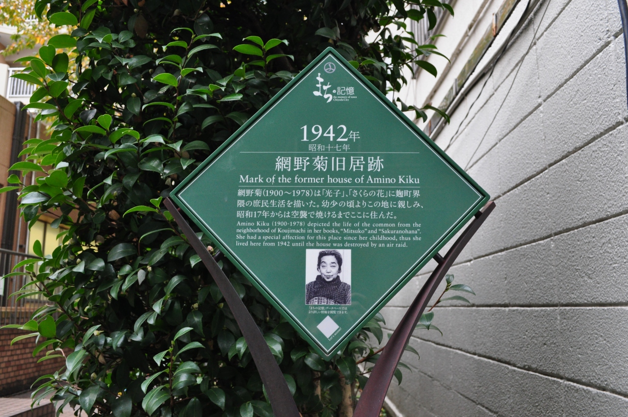 東京メトロ半蔵門線半蔵門駅と都営地下鉄市ヶ谷駅を結ぶ通り沿いにこの案内板が立っていました。東郷公園の南西の交差点の一角になります。網野菊は明治から昭和にかけて活躍した作家ですが、正直申し上げて、こちらの案内板を見て初めて名前を知りました。周辺には大使館や公園、学校などがあって静かな雰囲気の場所で、史跡なども多くある場所なので散策がてら立ち寄られてみるのもいいかもしれません。