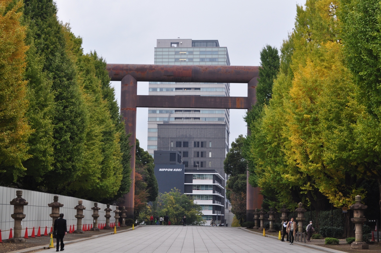 九段下駅方面から来て靖国神社に入り、参道を進むとまず最初に目に入るのがこの大きな鳥居になります。高さは25メートルもあり、とても大きな鳥居で見ごたえがあります。現在の第一鳥居は2代目で1974年に作られたものだそうです。全体的にかなり錆びてきており、見栄えはあまりよくないのが気にはなりますが、見ごたえは十分です。