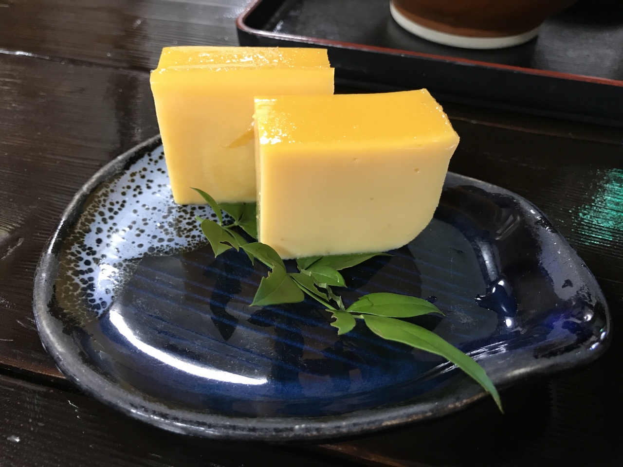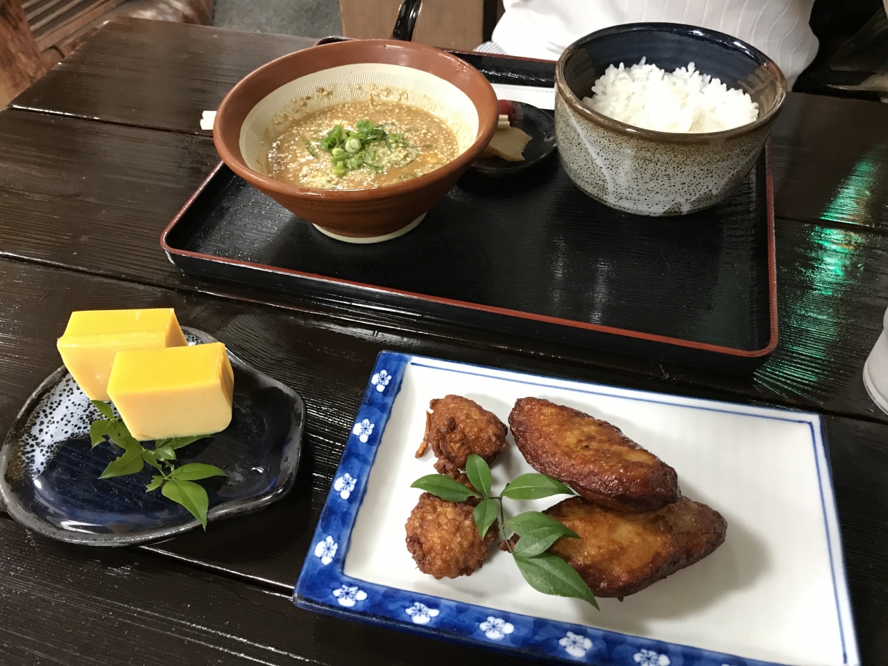 飫肥城の観光駐車場脇にある名物おび天のお店。おび天とはさつま揚げのことですが、こちらは店内で揚げたてをいただけます。飫肥のもうひとつの名物の厚焼き卵も食事処で提供しているので、いっぺんに食べることができます。宮崎郷土料理の冷や汁と合わせて単品で注文しました。厚焼き卵は表面がツルツルで甘くて硬めのプリンのようで美味しかった。
