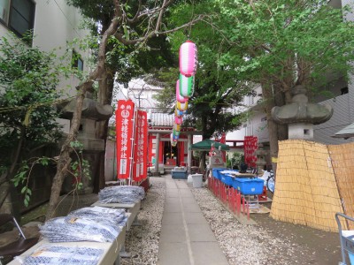 北斎通り沿いにある小さなお社です。かつてここに津軽藩の下屋敷があったそうで、その敷地内に祀られていた稲荷社が現在に至っているようです。祭りの日に訪れたため、敷地内には設営の準備で物がたくさんありました。訪問日を誤ったようで、手短に参拝を済ませました。