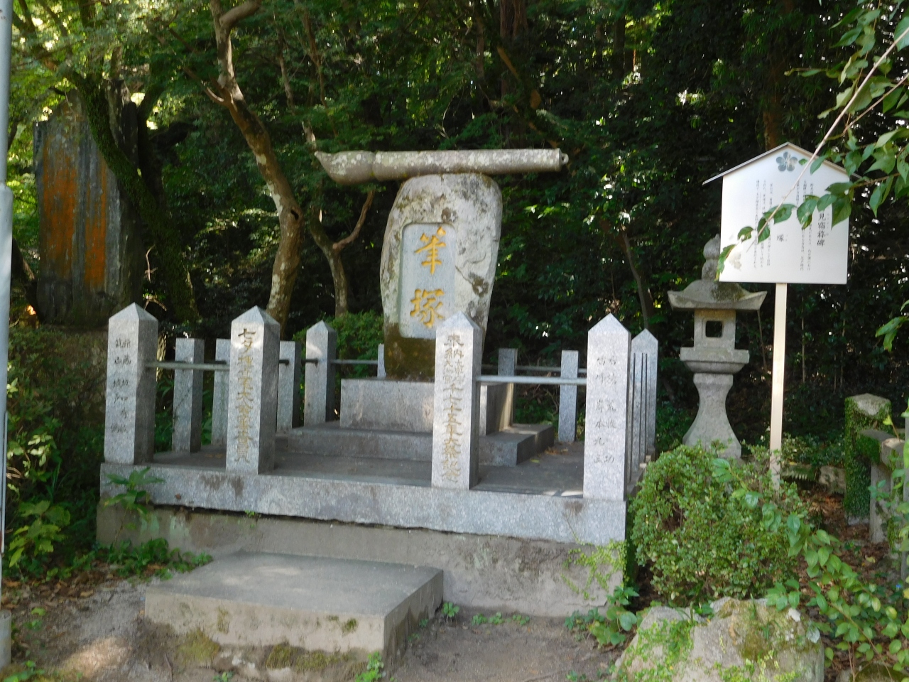 大宰府天満宮 本殿を参拝した後、右側から裏手に回った場所にありました。菅原道真は、弘法大師、小野道風とともに、書の三聖と称されていた為、書道や学問の上達を祈念して造られた像のようです。だいぶ年季の感じられる筆が塚の上に載っていました。あまり立ち止まって見ている人はいないようでした。