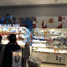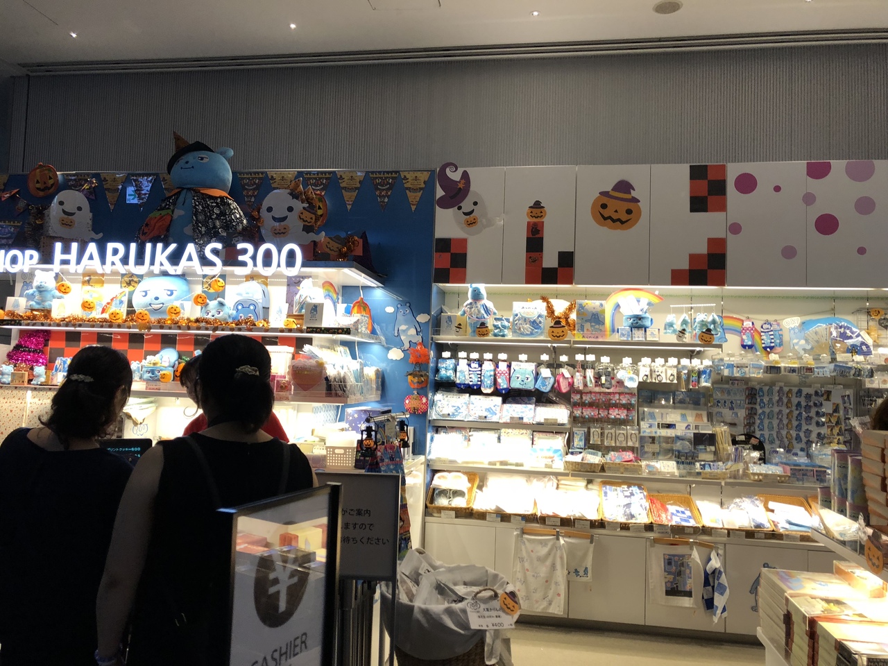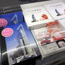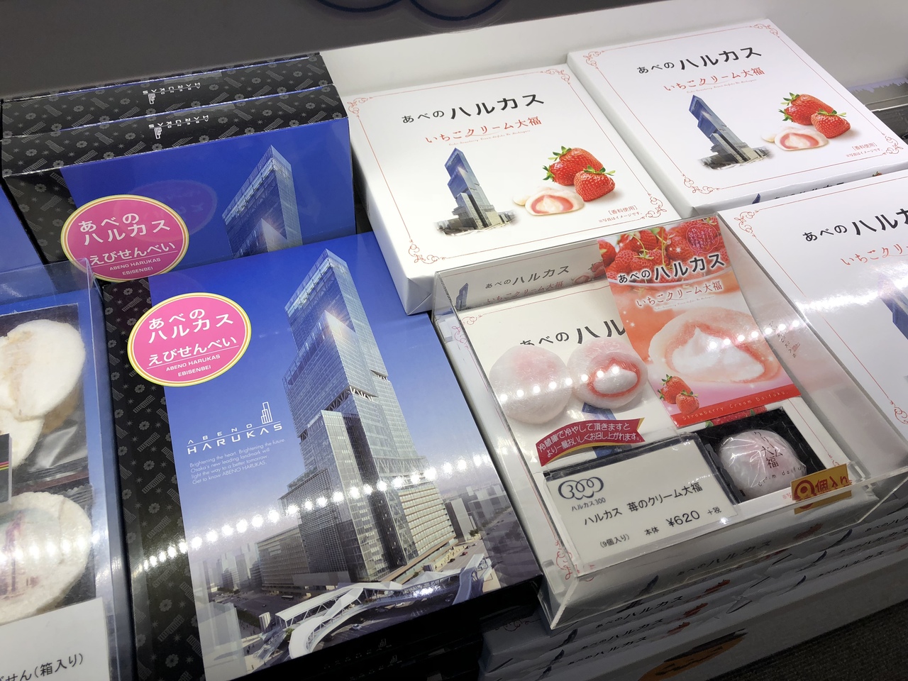ソフトクリームなどの販売もありますが、メインはお土産用のお菓子。大阪にちなんだもの、あべのハルカスにちなんだもの、工夫が凝らされていますが、苺大福とかエビせんべいとか、何でだかよくわからないものもありました。