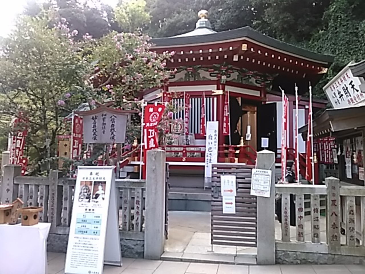 辺津宮の境内で、辺津宮の左隣りにあります。朱塗りの八角のお堂・奉安殿には、八臂弁財天と、日本三大弁財天のひとつとして有名な裸弁財天が安置されています。 江戸時代には、この江島弁財天への信仰が集まり、江の島詣の人々で大変な賑わいを見せていたようです。