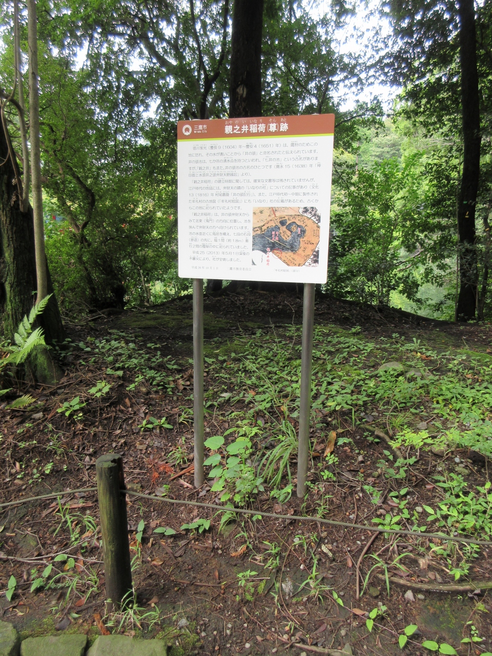 井の頭恩賜公園内の弁天橋北詰に説明板が立っています。江戸時代に井の頭弁財天の鬼門除けとして親之井稲荷神社が建立されましたが、2013年に不審火のため焼失しました。公園案内所でもらった井の頭町会作成の史跡さんぽマップに、焼失する前の親之井稲荷神社の写真が載っていました。商売繁盛の神や衣食住の守護神として信じられていました。説明板に井の頭の名前の由来なども記されていて、この土地を知ることができました。