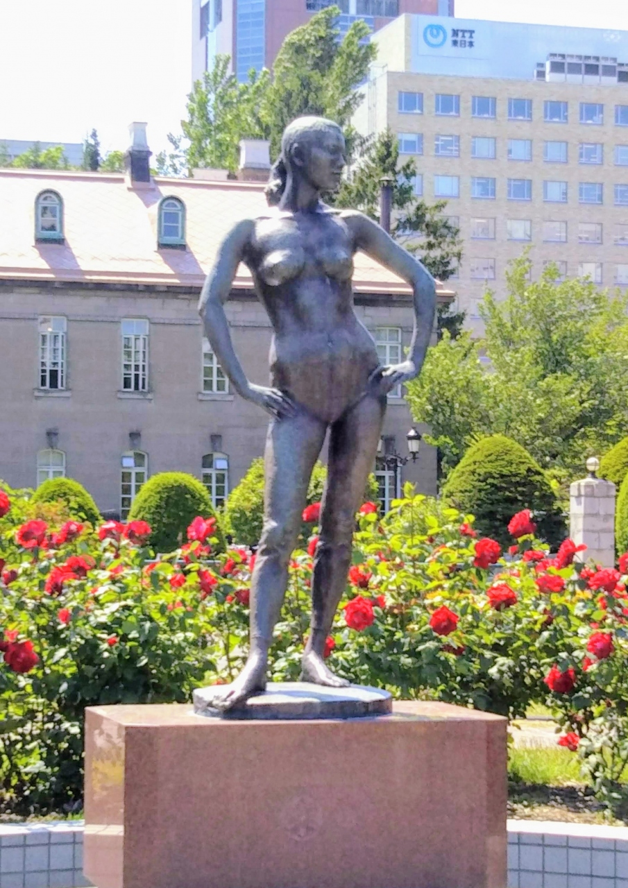 大通公園 西12丁目、バラ園の真っ赤なバラに囲まれて『若い女の像』はありました。