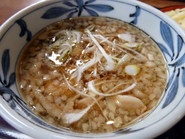 つけ汁は、豚バラ肉イッパイのつけ汁で、浮いているのは背脂かと思ったのですが、タマネギみじん切りでした。