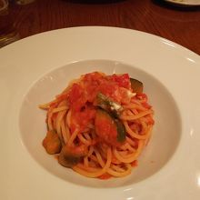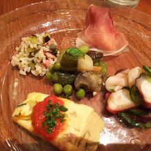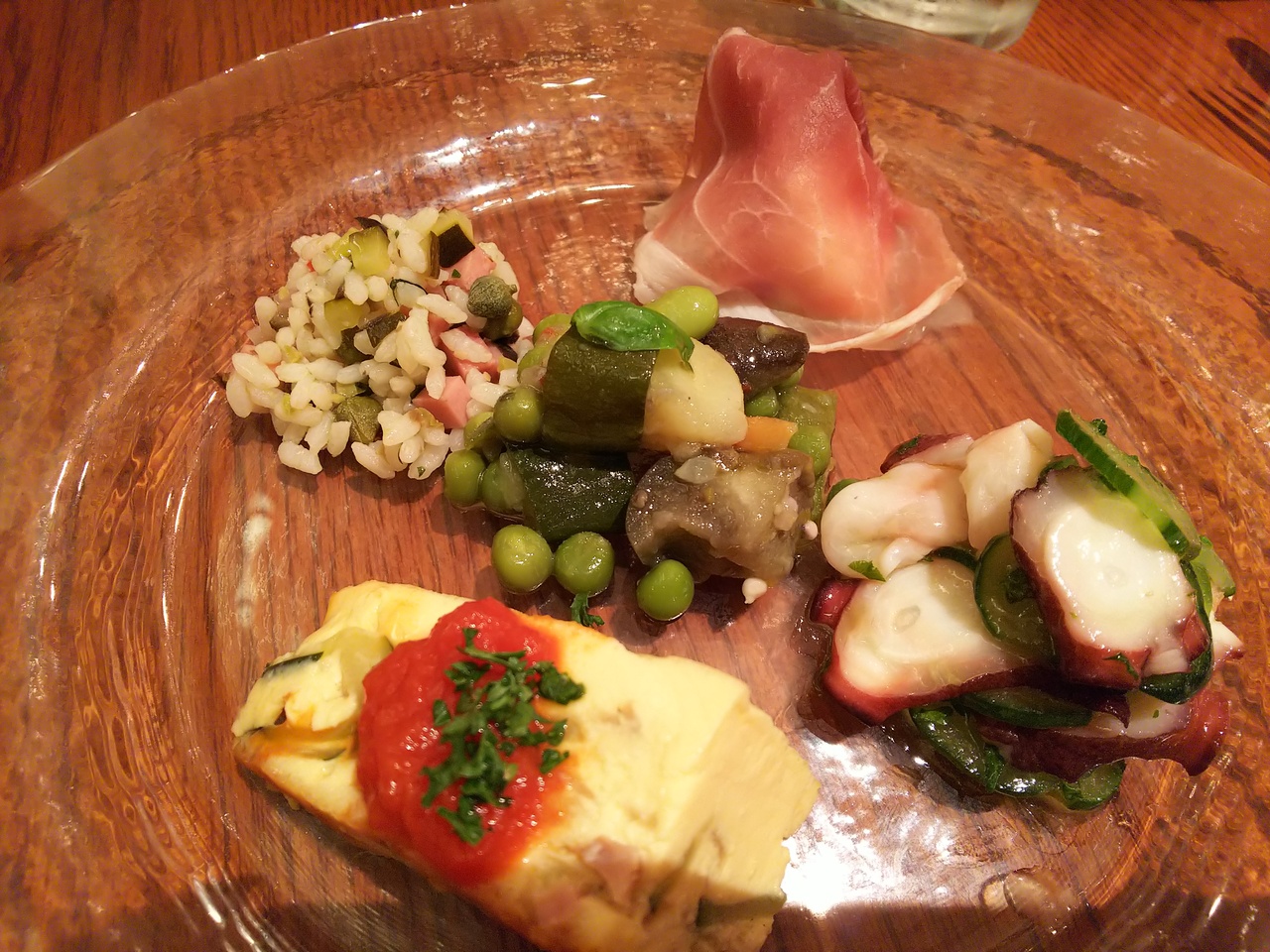 前菜盛り合わせ、パン、選べるパスタかピザにソフトドリンクの付いたナポリコースをいただきました。