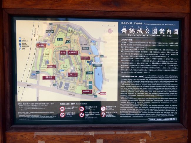 JR甲府駅南口から東に300mほどのJR中央線沿いに舞鶴城公園があります。
