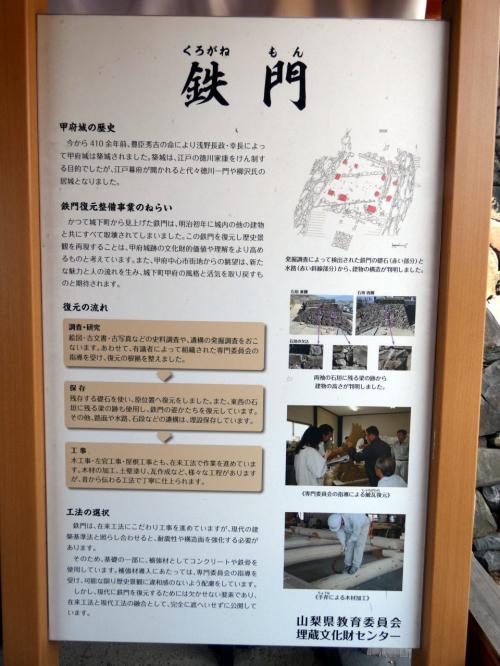 JR甲府駅南口から東に300mほどのJR中央線沿いに整備された舞鶴城公園内に復元された鉄門(くろがねもん)があります。