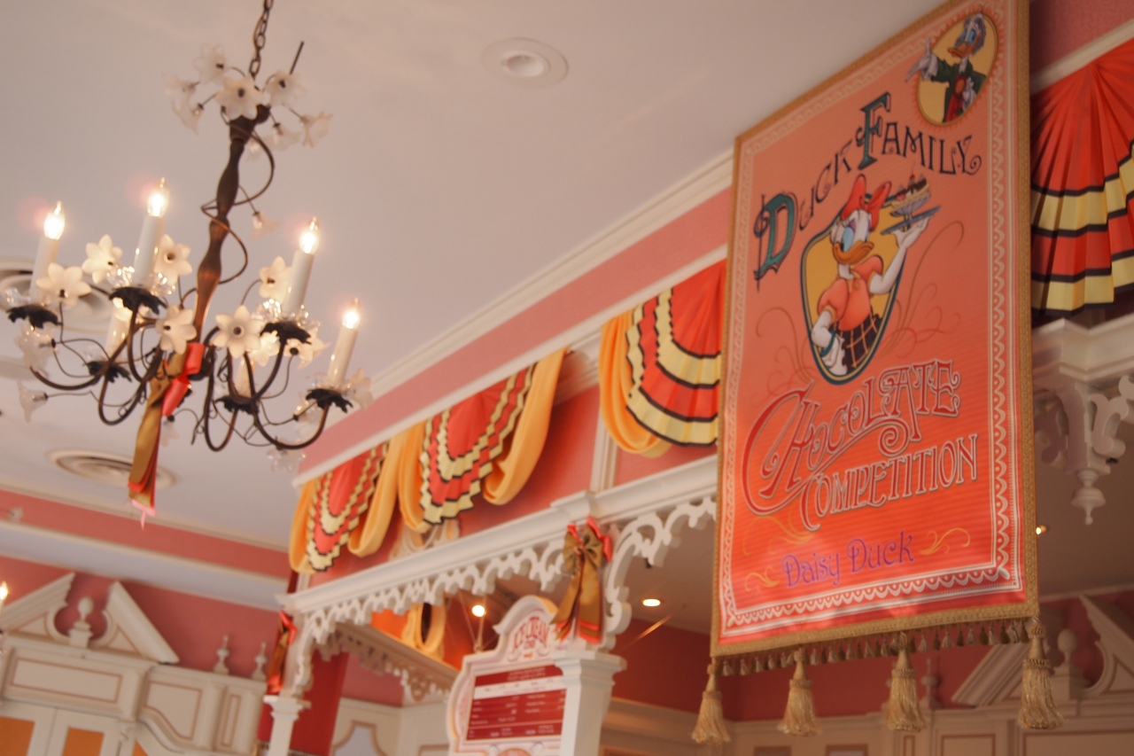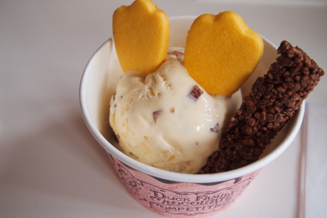 内装もクランチチョコレート仕様になっていて、可愛いデイジーやヒューイドゥーイルーイのイラストが飾られていました。せっかくなのでクランチチョコを使ったアイスクリームメニューを注文。