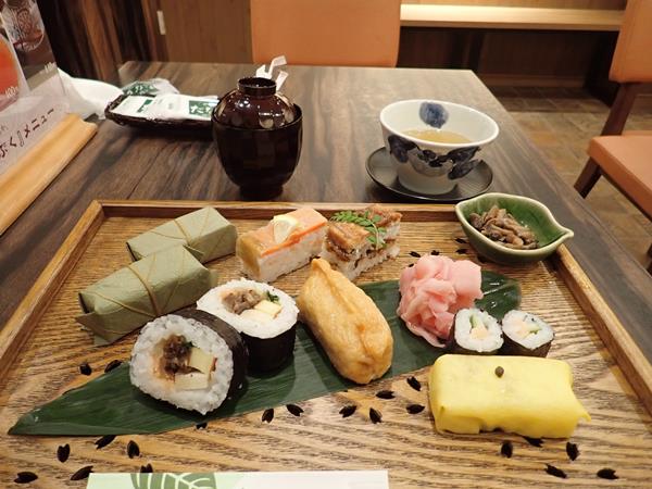 柿の葉茶屋で「おすしアラカルト」をいただきました。柿の葉すし、巻き寿司、巾着寿司、稲荷寿司がついて1080円。プラス220円でコーヒーも付けることができました。