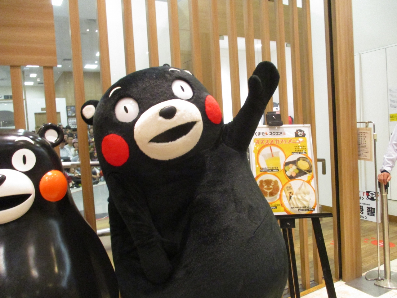 熊本といえばやっぱりくまもん!一緒に写真がとりたくてやってきました。ブームは去ったかと思いきや、子供や大人でいっぱいでした。並んでいるとくまもんがやってきてゆっくり手をふりながら歩いていく姿が間近で見れました!