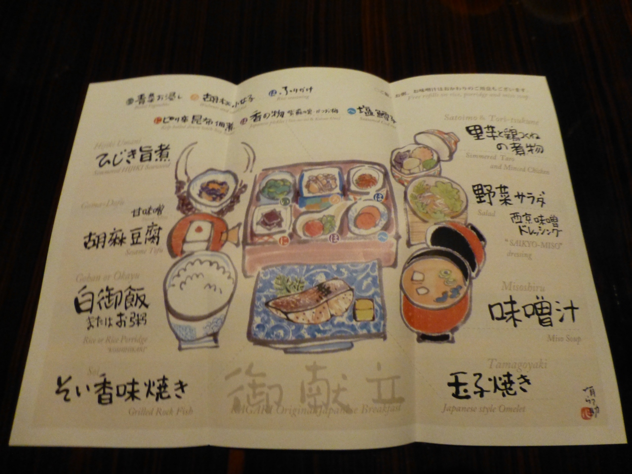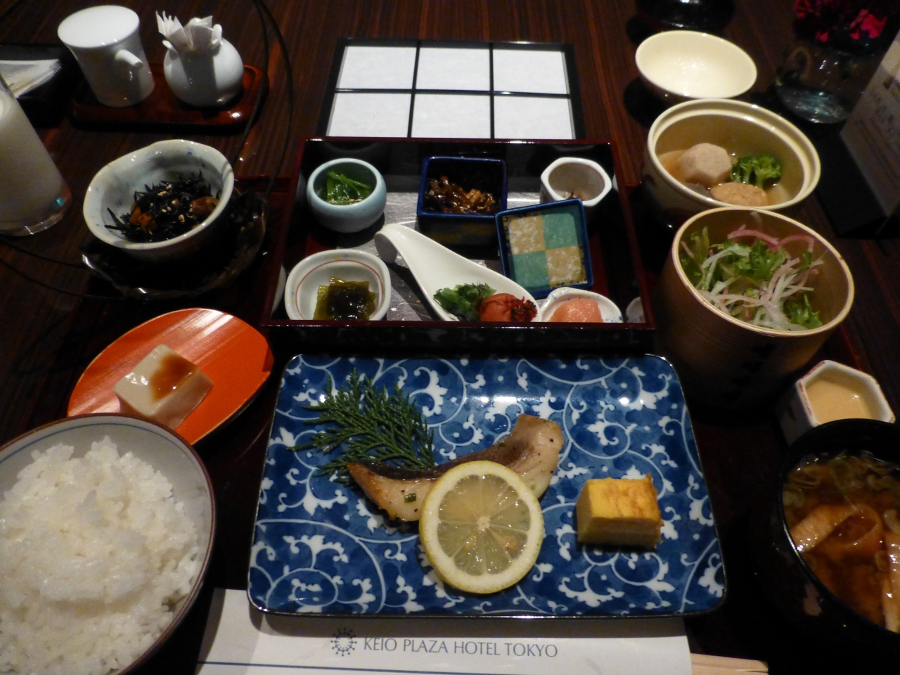 京王プラザに宿泊した際に朝食で利用しました。和定食です。ご飯とおかゆが選べます。おかずは焼き魚の他に煮物もあって、小皿料理も多く、結構なボリュームがありました。これらは綺麗な絵入りのメニューで説明されていました。