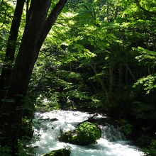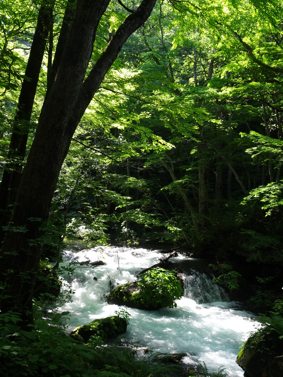2018年の夏に奥入瀬渓流を観光した時は、石戸から雲井の滝の間の散策と、銚子大滝の周辺を散策しました。ここは銚子大滝の近くにありますが、はっきり言って、他の急流に比べたら物足りず、少しがっかりでした。銚子大滝近くでは、数少ない急流スポットなのに、残念です。急流は石戸周辺で楽しみましょう。