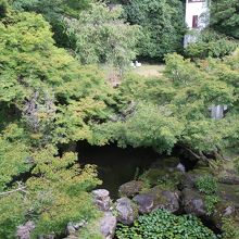 アサヒビール大山崎山荘美術館の2階北側(山側)のテラスに出ると北側庭園の最奥に白い三角屋根の物見塔が見えます。この塔が栖霞楼です。テラスに説明版はありますが、北側の庭園には入ることは出来ないので近くでは見学できず、唯一2階テラスからしか見られません。