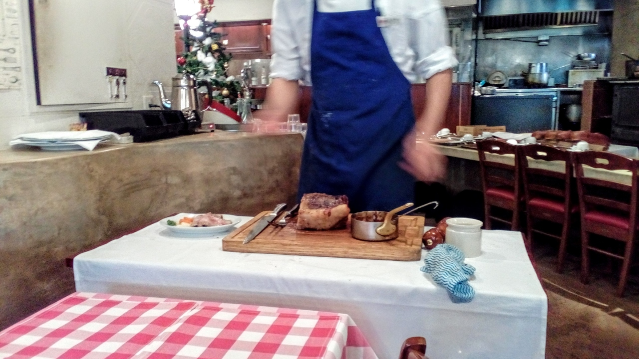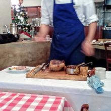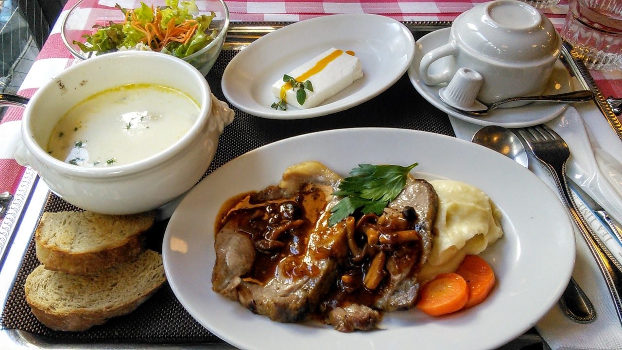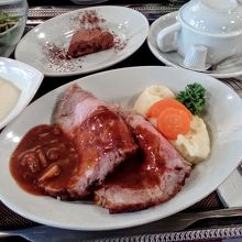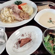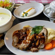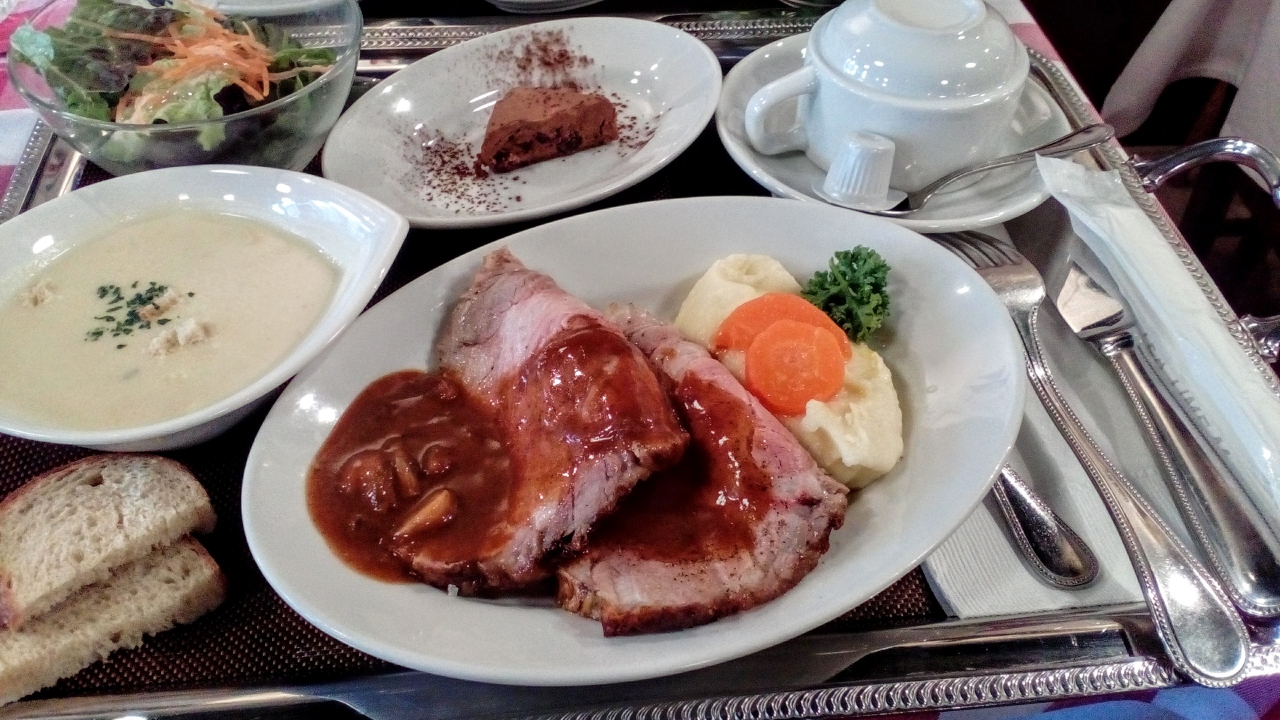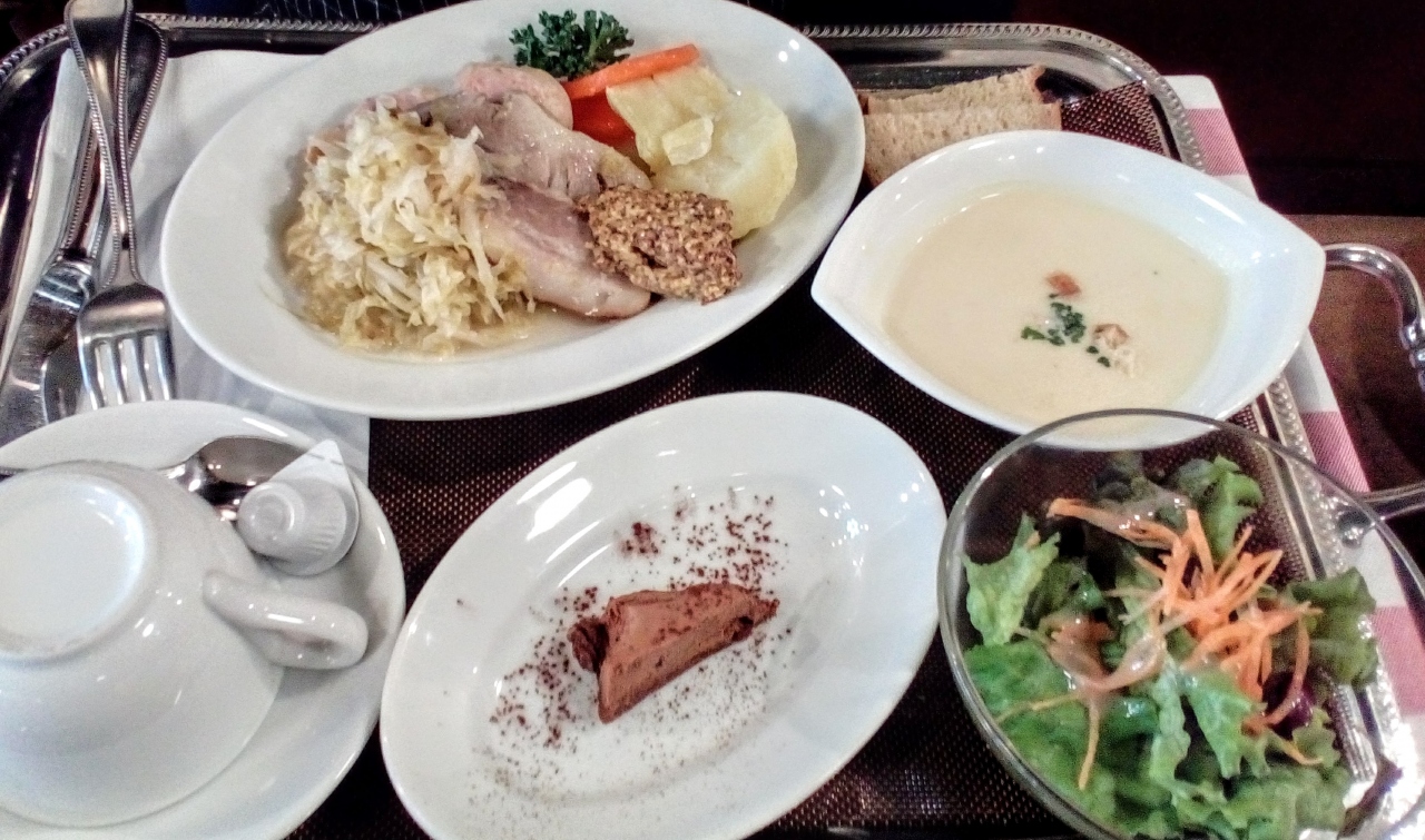 スペイン坂のトリコロールのフランス国旗が目印のビストロです。お盆の上に、スープ、サラダ、パン、メイン料理、コーヒーがセットされて運ばれてくるランチは、何となく給食のようで楽しい演出、価格も1000円からとお手頃です。お店のおすすめは、鹿児島県産茶美豚を使ったメニューで、特にローストポークは目の前で塊肉から切り分けてくれます。茶美豚と自家製ソーセージのシュークルートも、豚のプレゼ赤ワイン煮込みも、どのメニューもみなおいしくいただきました。コーヒーだけは、食べ終わるのを見計って、入れてくれます。