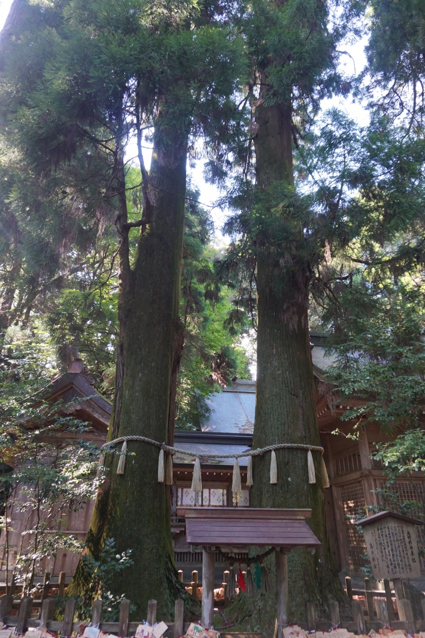 高千穂神社内にある夫婦杉です。根元が一つになっていていかなる時でも離れない形をしているので夫婦杉と呼ばれています。