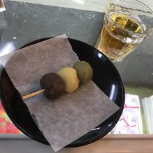 店頭で坊っちゃん団子を作っており、その場で食べる(1本100円)場合、お茶を1杯サービスしてもらえます。