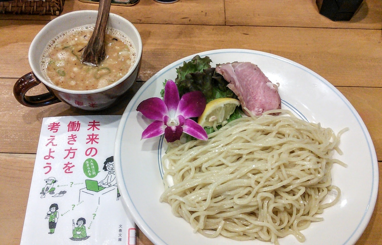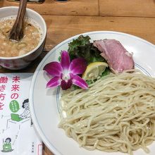 店長がハワイ好きなため、お店のインテリアもさわやかで小綺麗なラーメン屋さんです。「麵屋」と名乗っているように、麺にこだわりを持っていて、全粒粉とハワイの水を使った栄養価の高い手打ち麺です。訪れた金曜日は、つけ麺のみの日で、みそつけ麺をいただきました。お花でハワイらしさを演出しています。