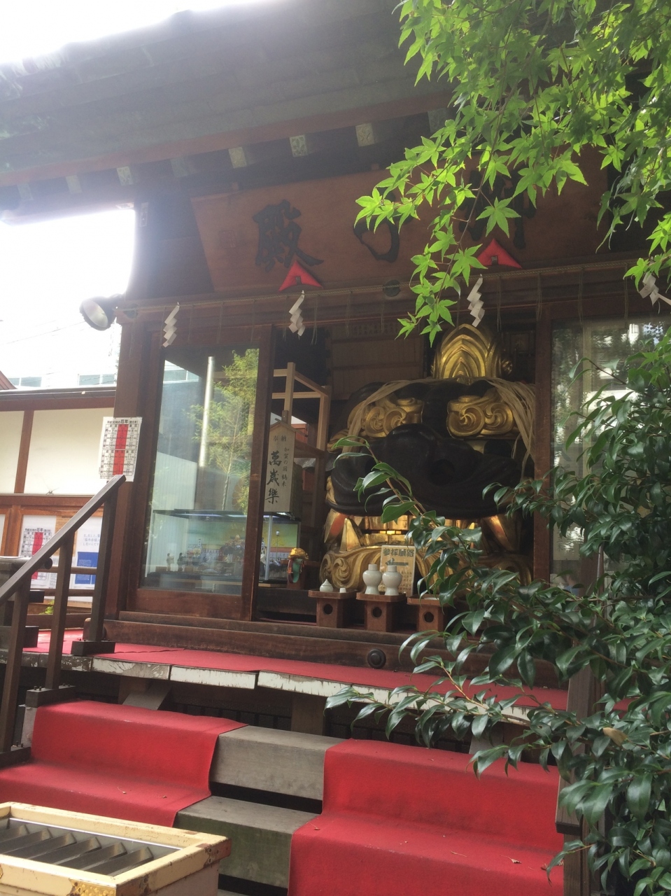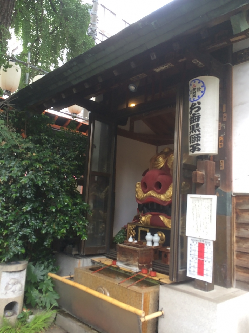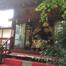 波除稲荷神社の境内入ると左右にあり、右側の獅子は祭壇のように赤い絨毯のようなものが敷かれお供え物が置いてあり、左側の獅子の前には手水場があるので、参拝者には必ず目につく獅子です。獅子は屋根がある建物の中にあり、目が金色でした。