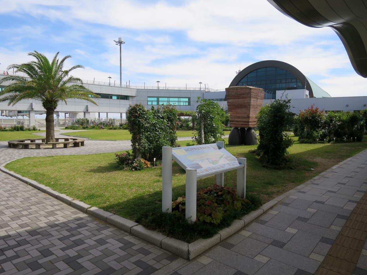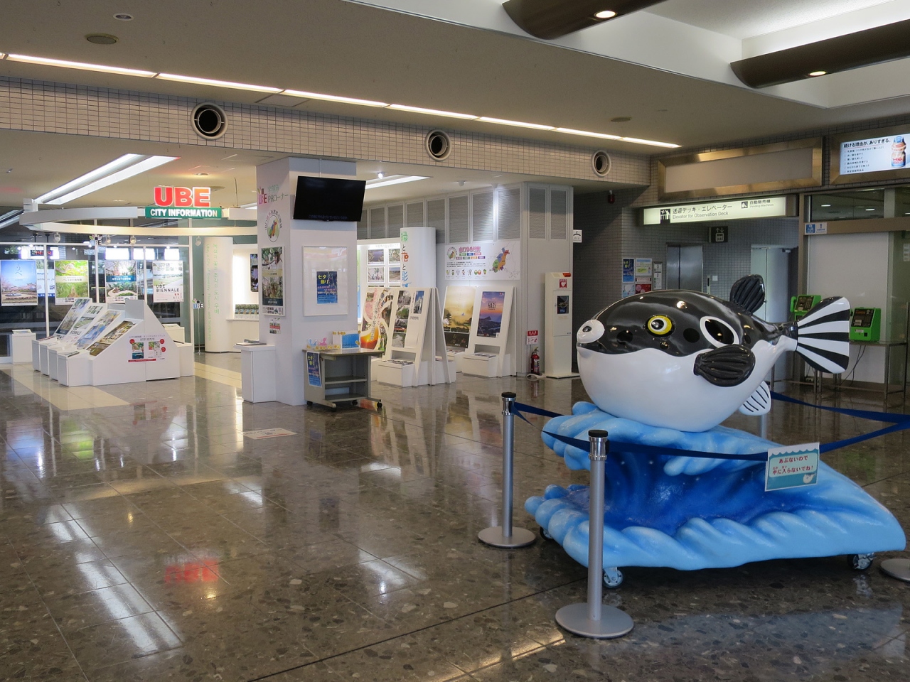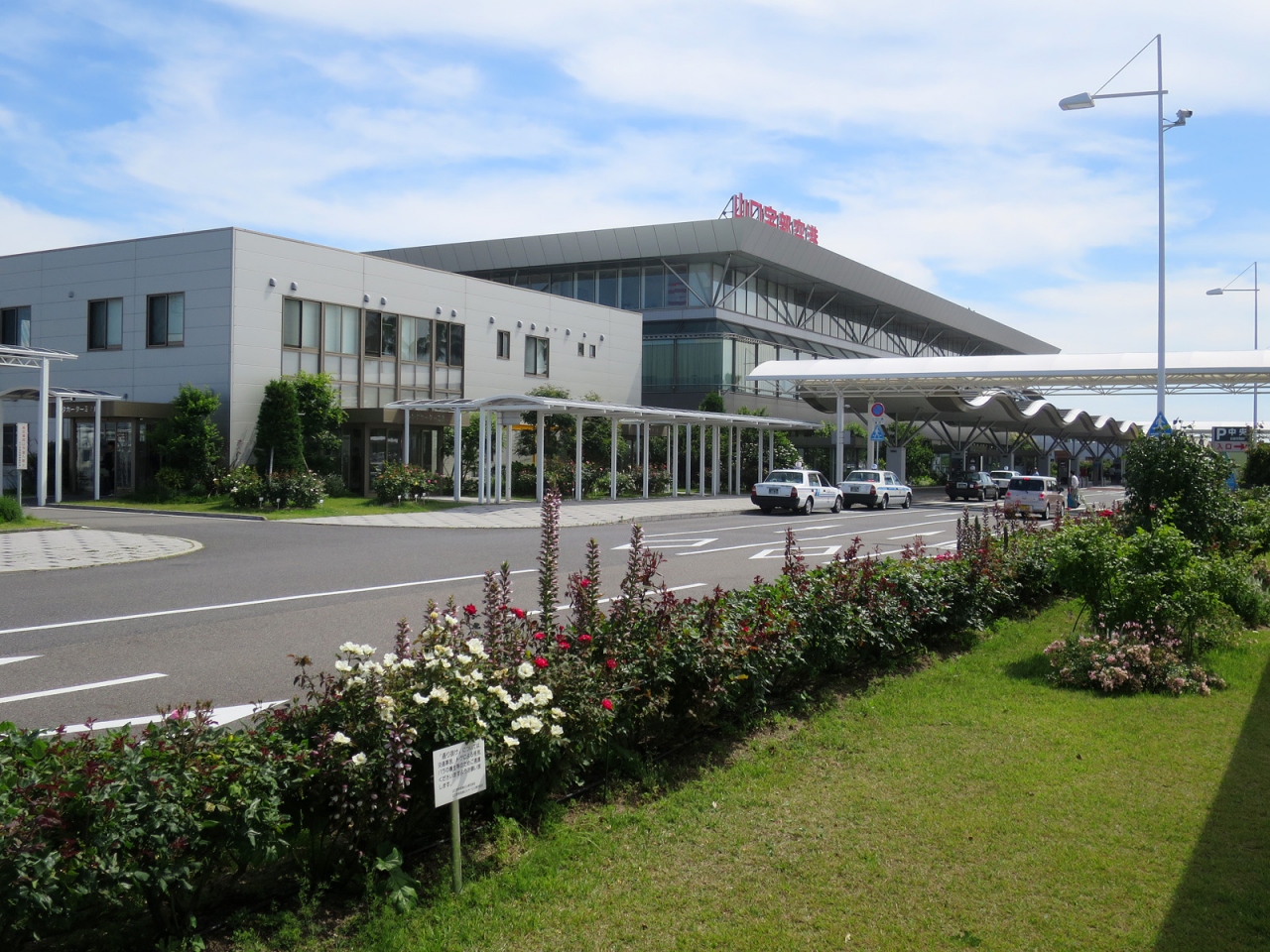 - ガラス張りの綺麗なターミナルビルには山口県産品にこだわった売店、ターミナルビル正面には噴水やバラ園、彫刻作品のある広場など美しい空港です