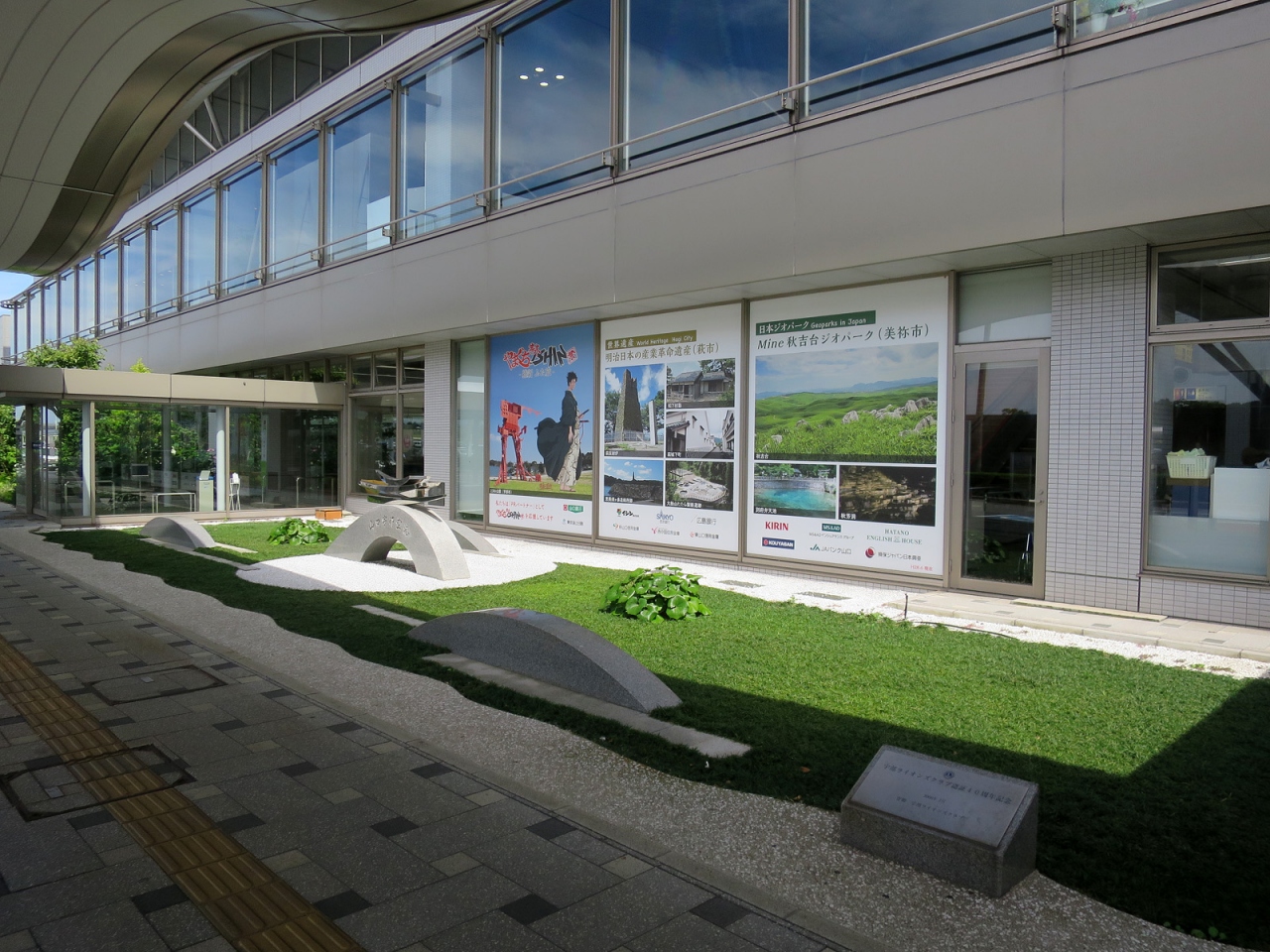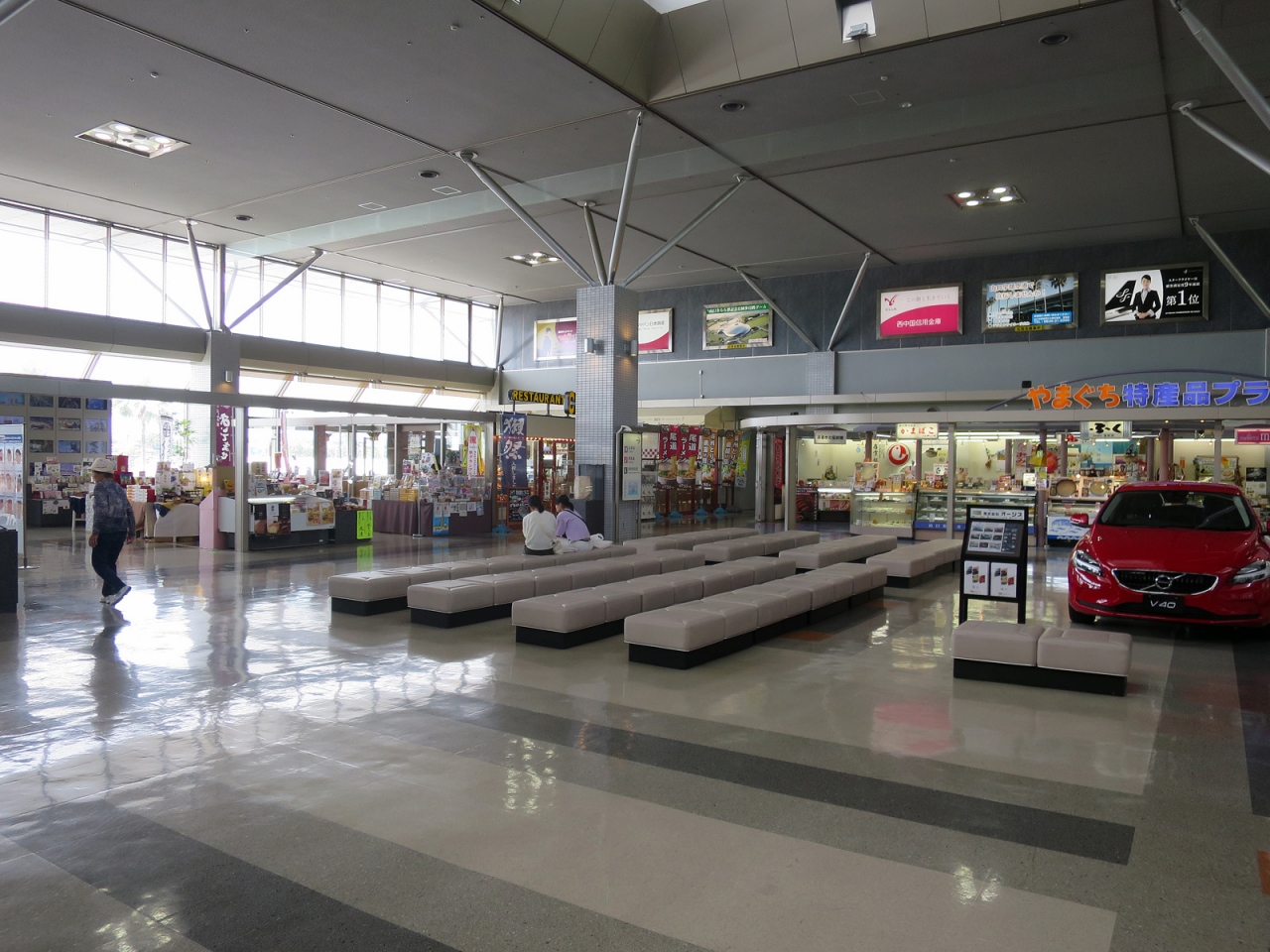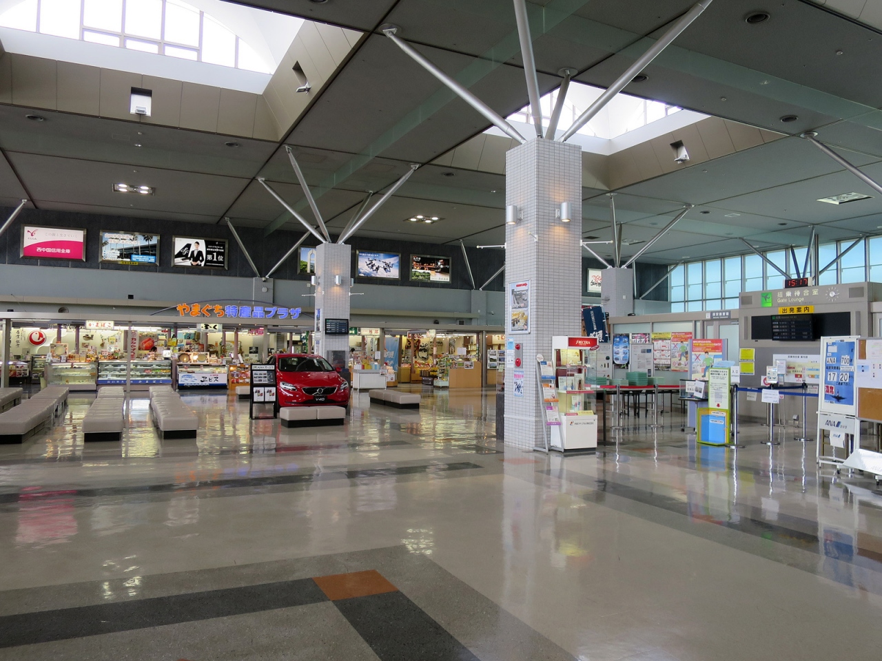 - ガラス張りの綺麗なターミナルビルには山口県産品にこだわった売店、ターミナルビル正面には噴水やバラ園、彫刻作品のある広場など美しい空港です