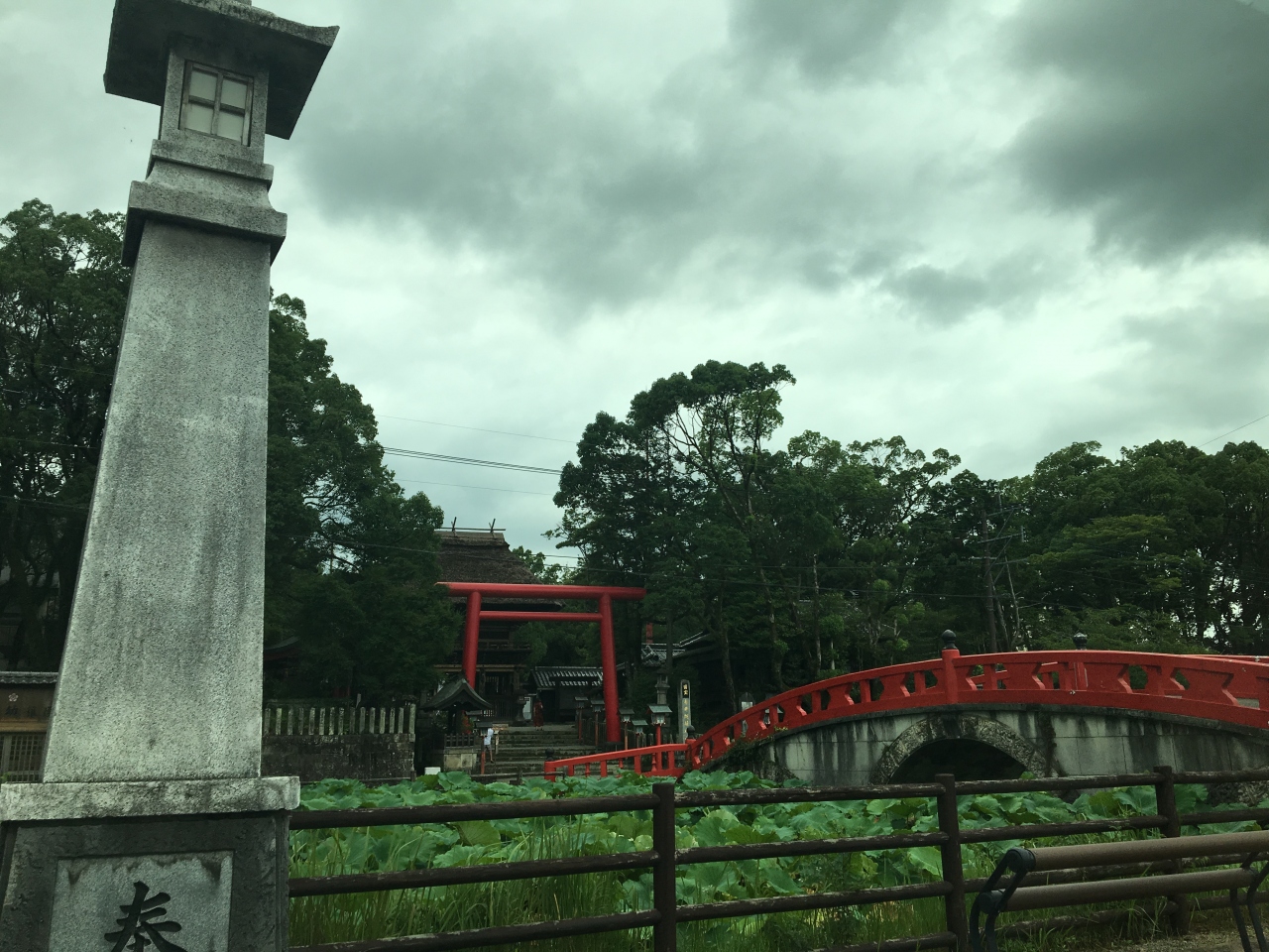 蓮の時期にいくと、神社の前の池に蓮の花が浮かび、朱の橋と鳥居が相まって神秘的な日本といった趣になります。海外の人にもうけそうなビジュアルです。