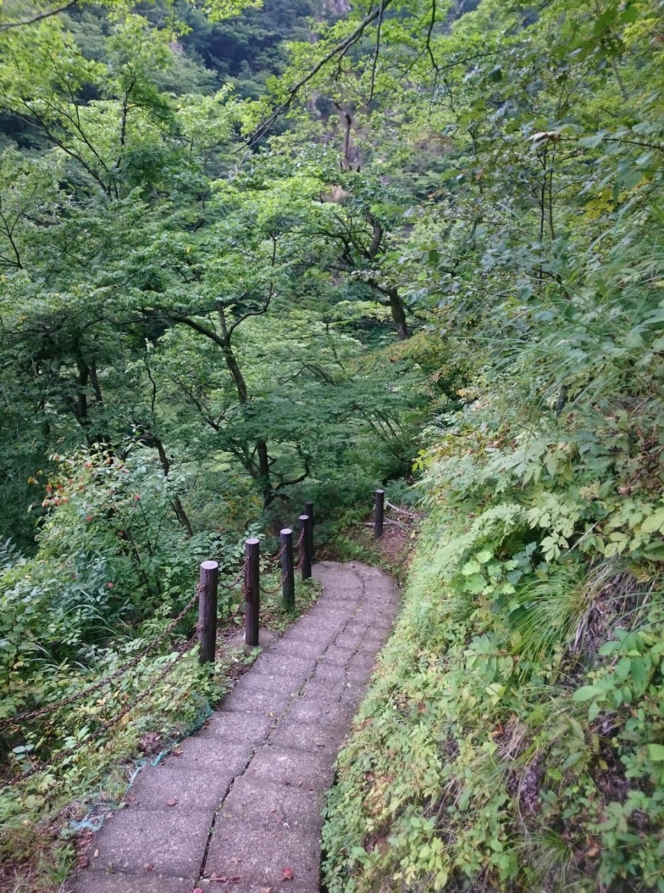 渓谷を楽しむ遊歩道ですが、現在、下流の鳴子温泉側の道は閉鎖され、上流の中山平側のドライブインからのアプローチのみで、折り返しコースとなっています。まあ、車を停めて歩くなら、折り返しの方でもいいでしょう。