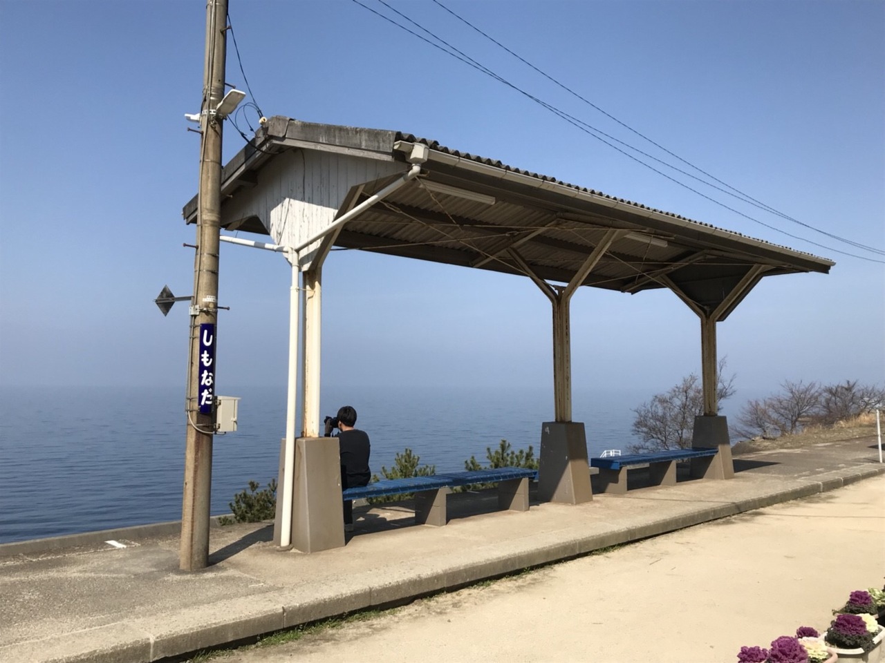 晴れていれば青い空、青い海が見渡せてとてもいい場所だと感じます。カップルや女子旅など合わせて5人くらい、自分たちのような若い人たちが駅にいて写真を撮っていました。