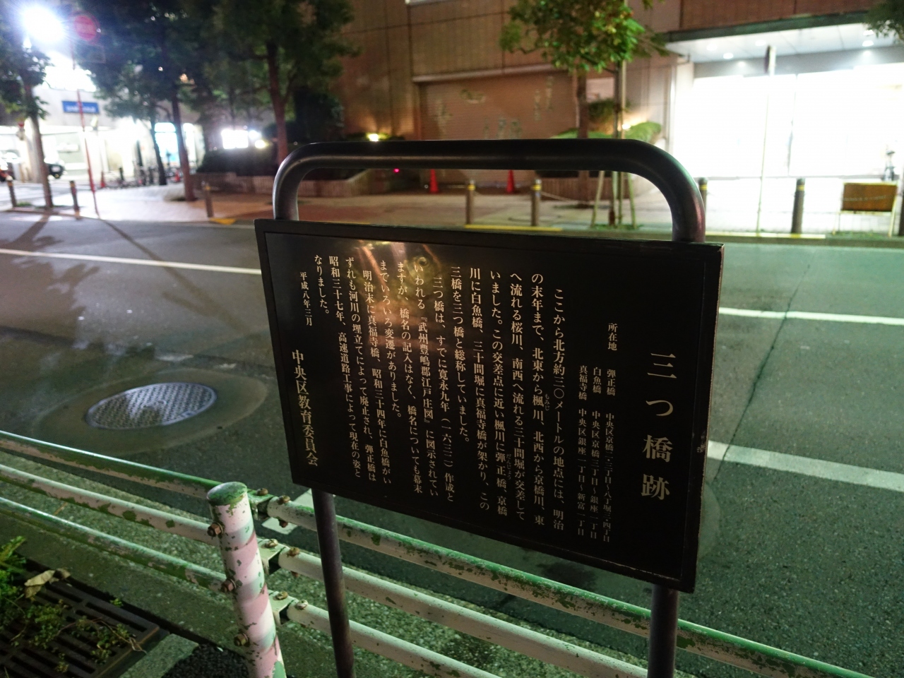 銀座一丁目の人通りの少ない裏通りに「三つ橋跡」の案内板のみが設置されています。