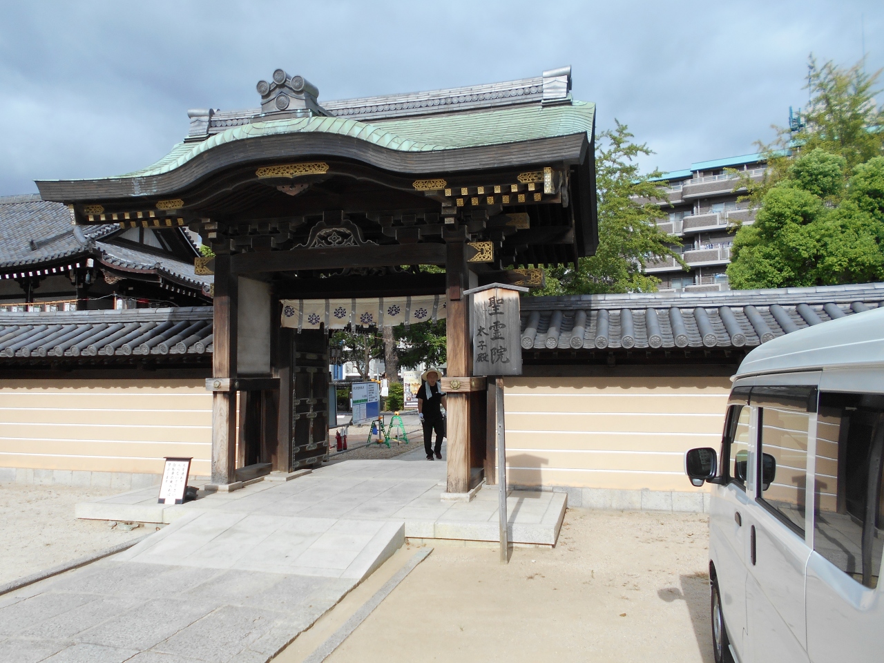 四天王寺南東境内に建ち南唐門の前にあります。聖徳太子を祀る堂で太子堂とも呼ばれます。西側境内の建物と違い木造らしい建物で落ち着きが感じられます。緑青の屋根が架かる小さな山門虎の門を入ると聖霊院。こちらも木造の柱で建つ本殿で落ち着きがあります。玉砂利に覆われた境内の素晴らしいですが改装中でした。山門、本殿には彫物が多くありそれをじっくり見て回るのも良いと思います。