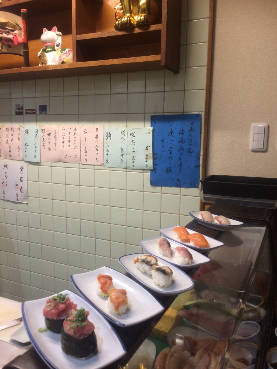17時から24時からまで営業の立ち食い店で6~7人も入れば満席です。予め握った寿司がカウンター前に置いてあり自由に取ることが出来ます。お好みの寿司をオーダーでした握ってもくれます。醤油は瓶等に入っているものでなく、ハケで塗るタイプの醤油でした。味は普通でした。