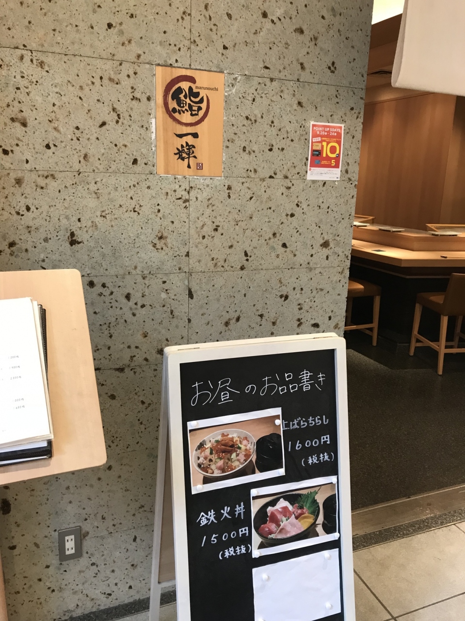 有楽町国際フォーラムからも歩いて目の前にある丸の内のTOKIAのレストラン街にあります。寿司処の一輝です。回転寿司にはない落ち着きがある店内です。ランチメニューのバラちらしは1600円と高めですが、うににマグロなど豪華なネタです。