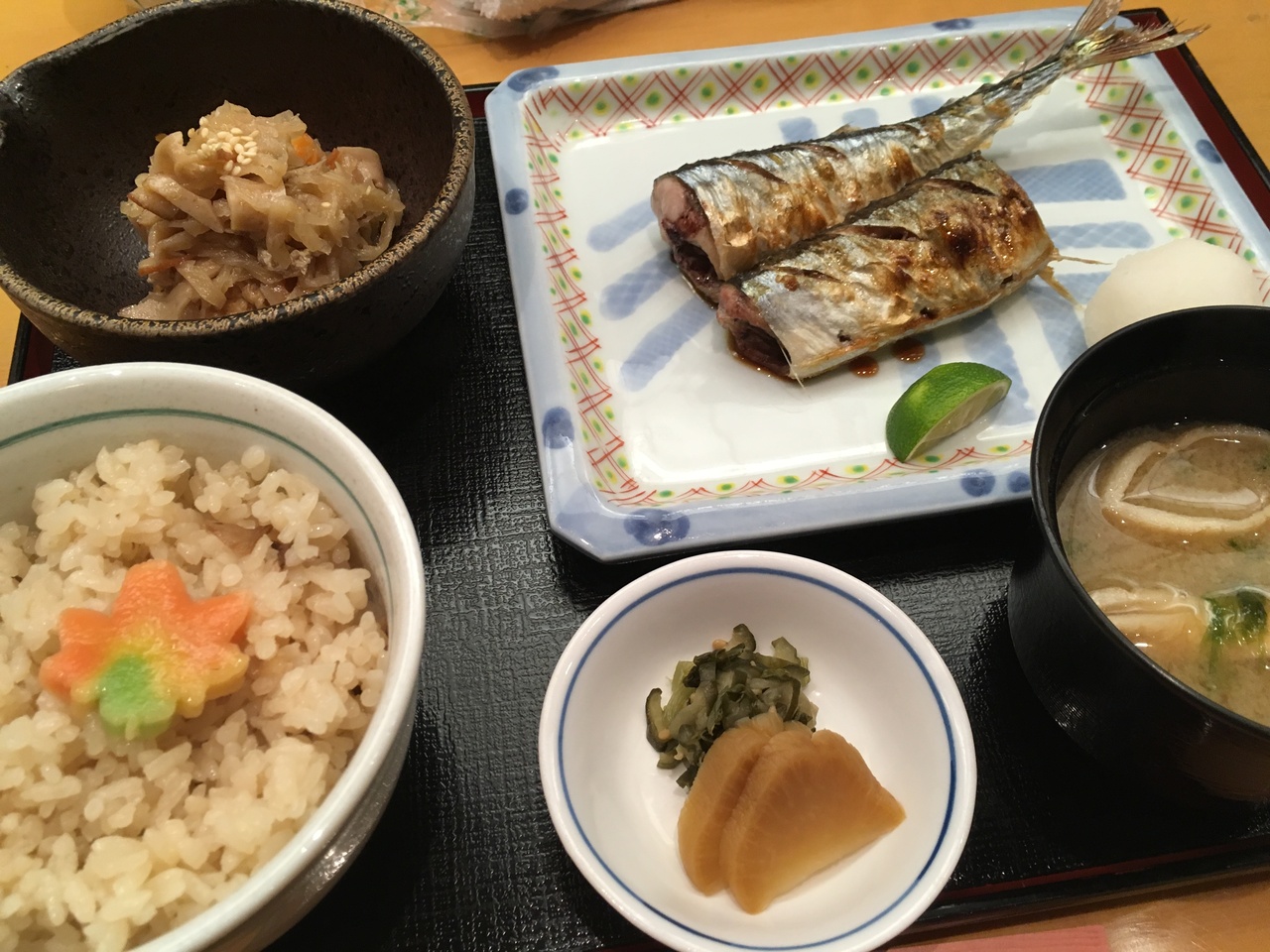 平日の13時前に訪問。この辺りなら美味しい昼食が食べられるだろうと当たりをつけて日本橋三越の対面裏側辺りを歩いて見たところ、店の前に「今月のお勧め:秋刀魚の塩焼き、松茸の炊き込みご飯」の文字を見つけ、入店。